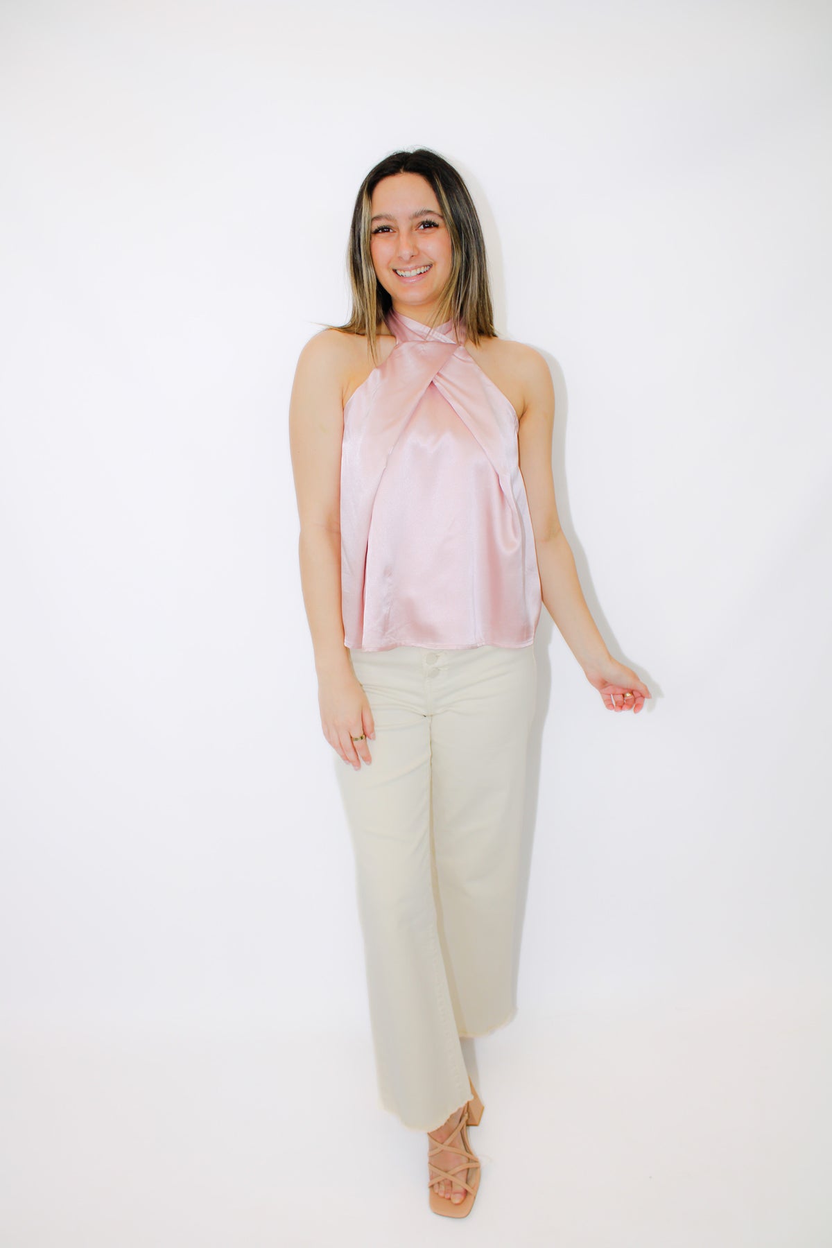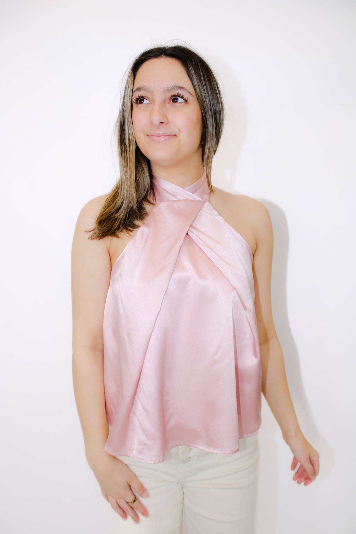 Step out in style with this halter neck satin top. Its smooth fabric and design will make you feel like a true fashion connoisseur. The front pleated detail adds a touch of elegance, elevating your look to new heights. Whether you're attending an event or simply want to make a statement, this top is the perfect choice.