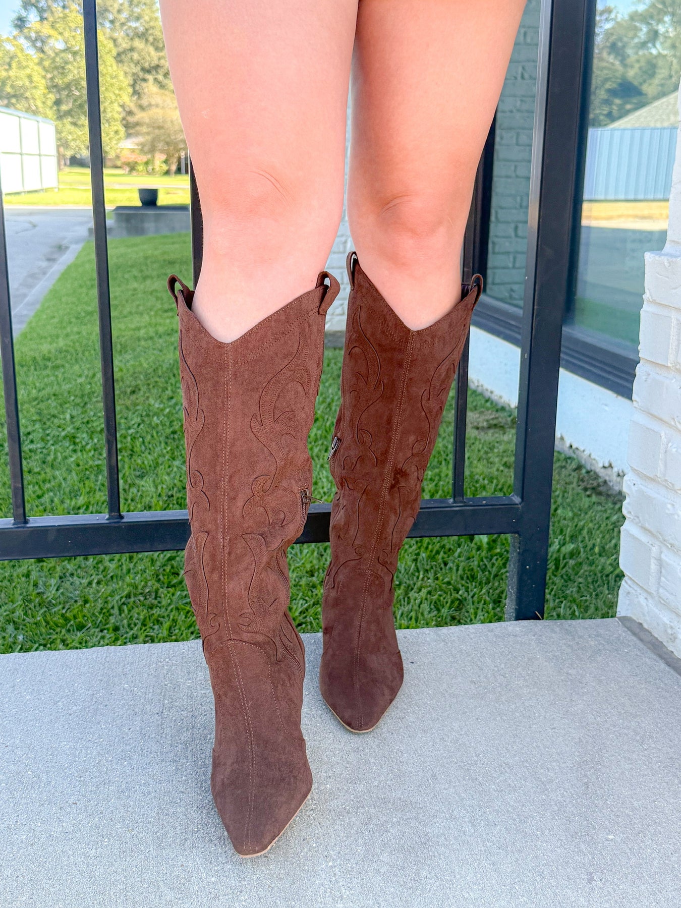 Tall vegan suede boot with western-inspired stitching, pointed toe, and slim high heel
