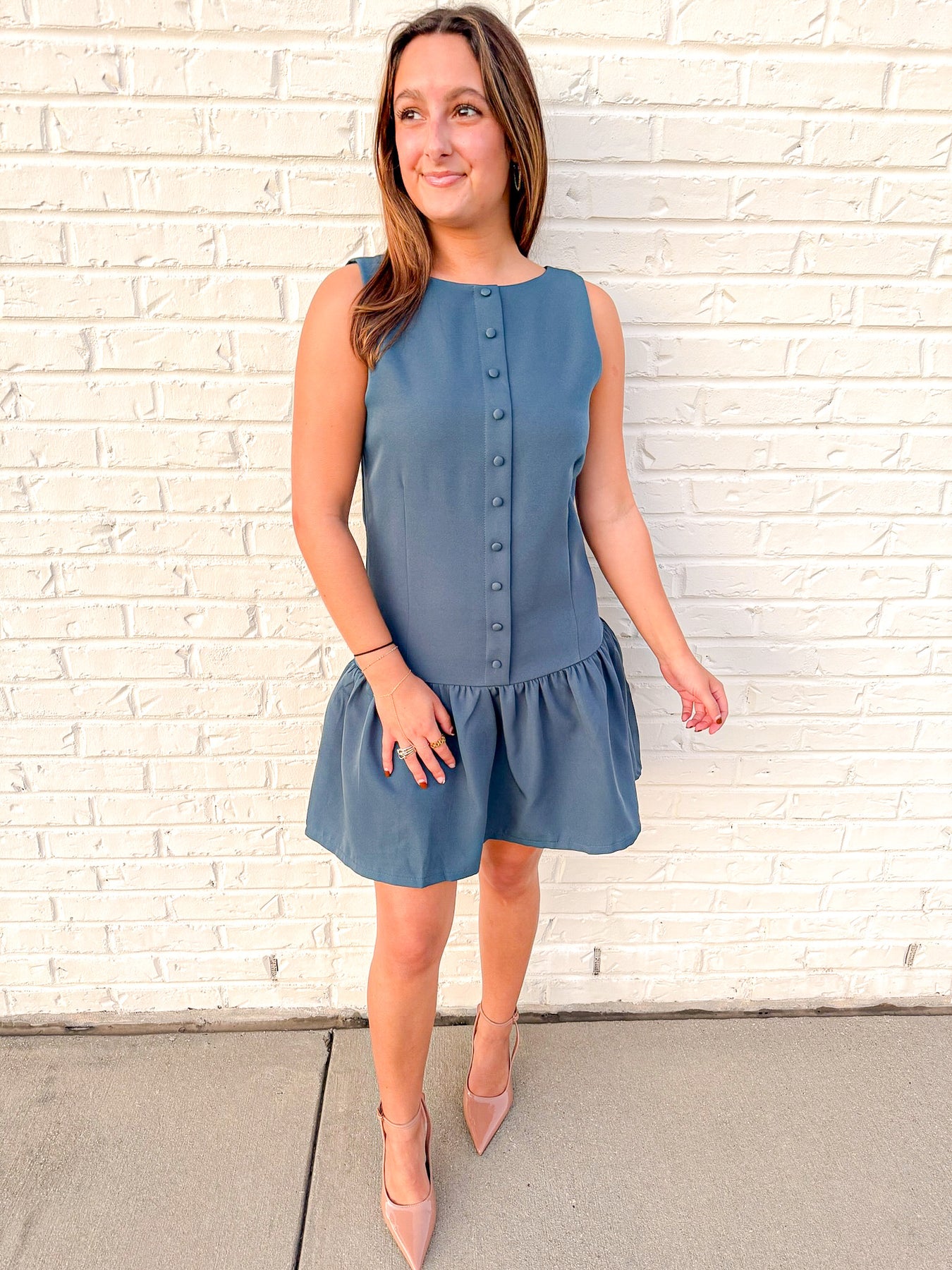 Understated elegance meets easy movement in the SERENE DROP WAIST DRESS. Featuring tonal buttons along the front and a flirty gathered hem, this sleeveless mini brings timeless style with a modern twist.