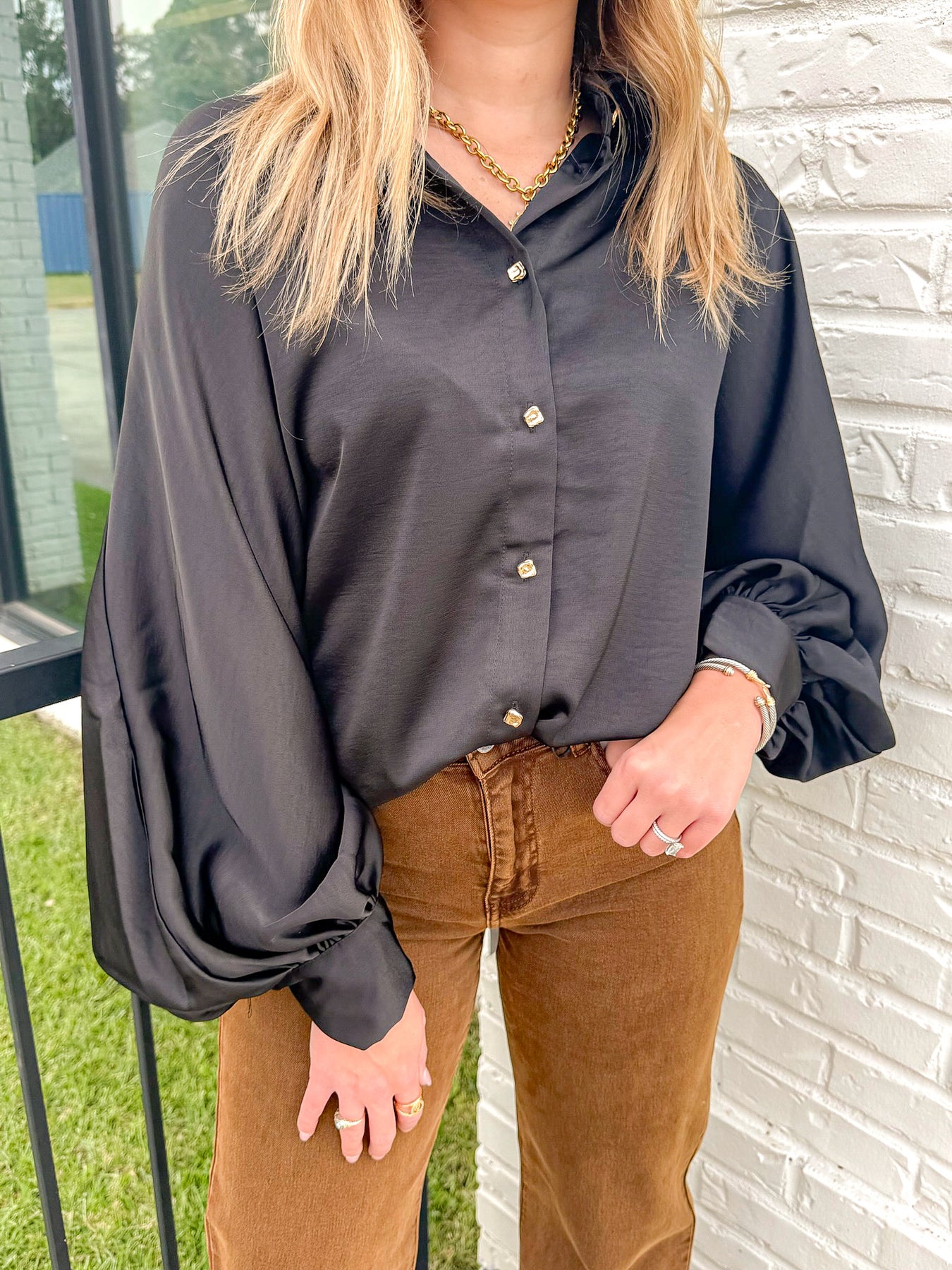 Elevate your wardrobe with the SATIN SOCIETY BLOUSE—a luxe take on the classic button-down. Designed with a relaxed silhouette, statement balloon sleeves, and polished button details, this blouse drapes beautifully for both work and play.