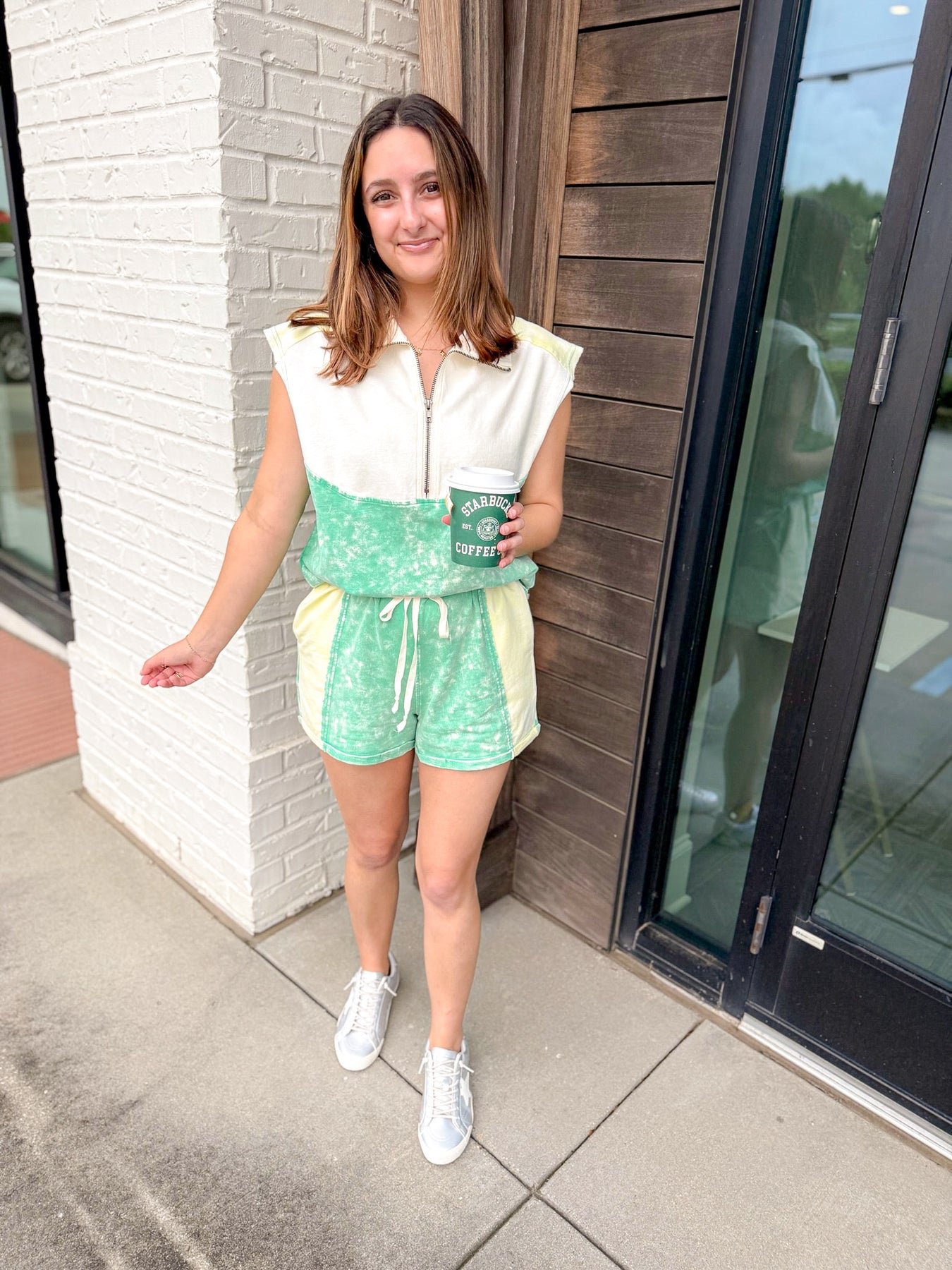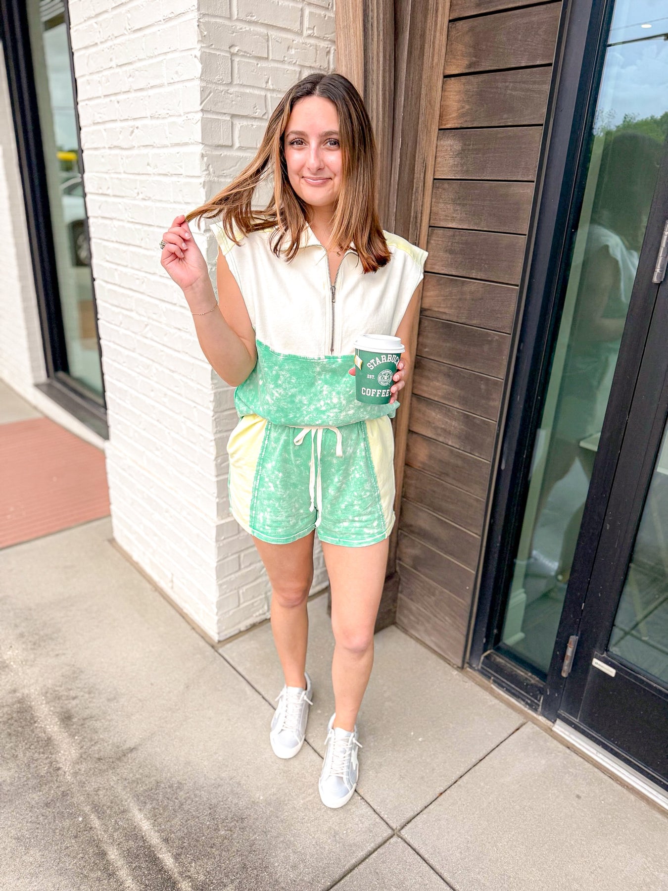 The MORNING MATCHA TOP is your go-to for laid-back, effortless style. Designed with a relaxed fit, soft washed fabric, and a sporty half-zip neckline, this piece blends comfort with a clean, elevated feel. The cap sleeve detail adds a modern touch, while the color-block design keeps it fresh and on-trend.