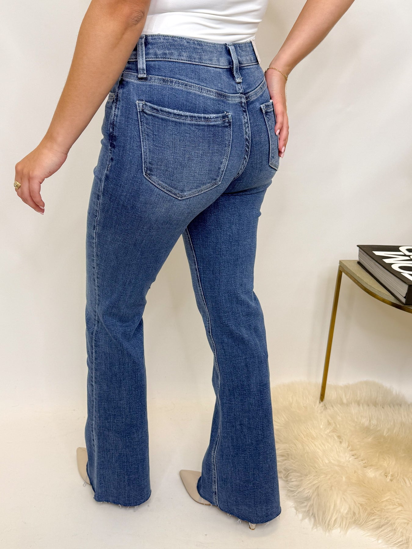 Elevate your denim game with these high-rise flare jeans. Designed with comfort stretch denim, they hug your waist and hips before flowing into a wide flare leg for that timeless, elongating look. The raw hem adds just the right touch of edge, making them perfect to dress up with heels or down with sneakers. A must-have pair that transitions effortlessly from day to night.