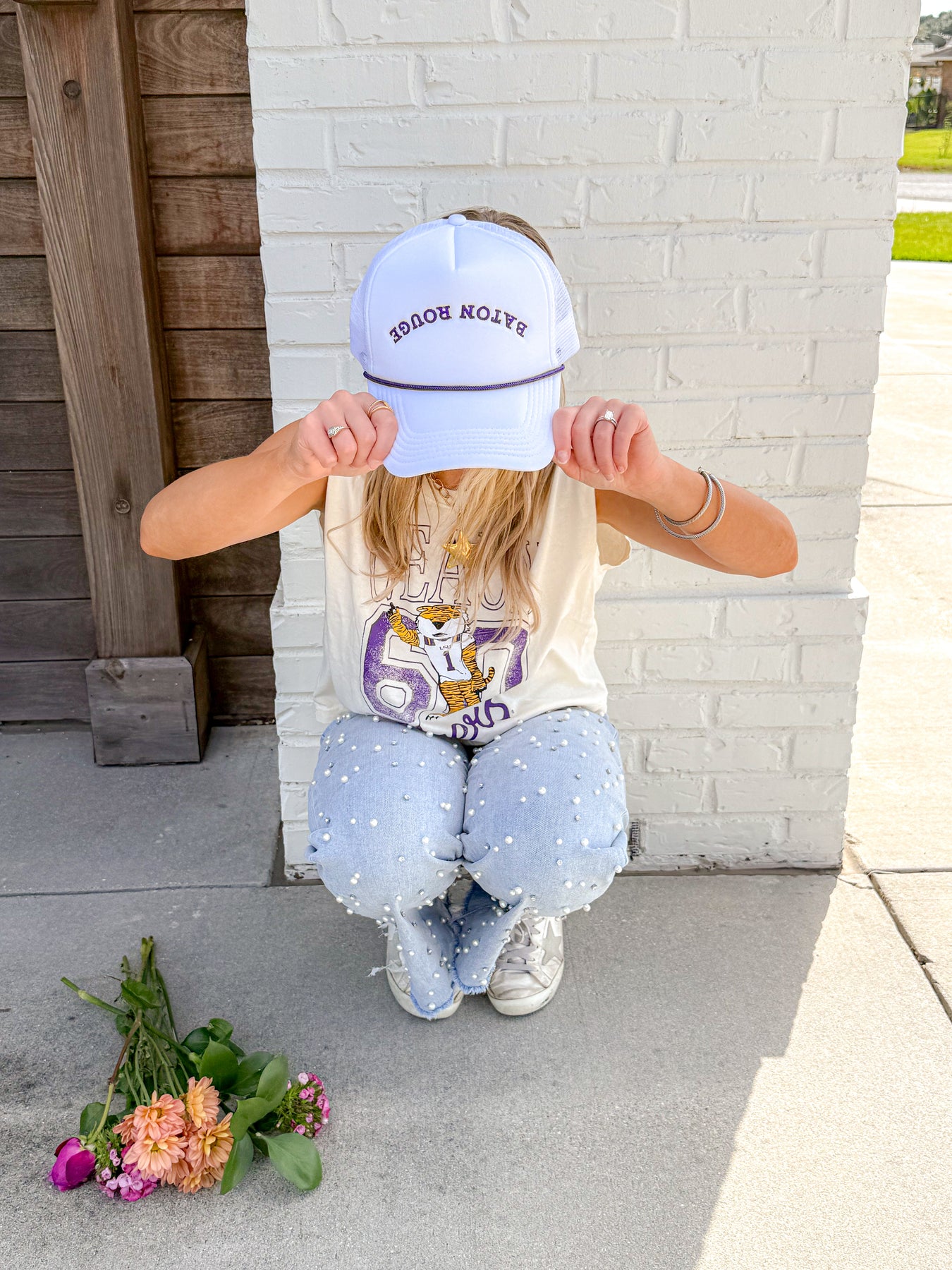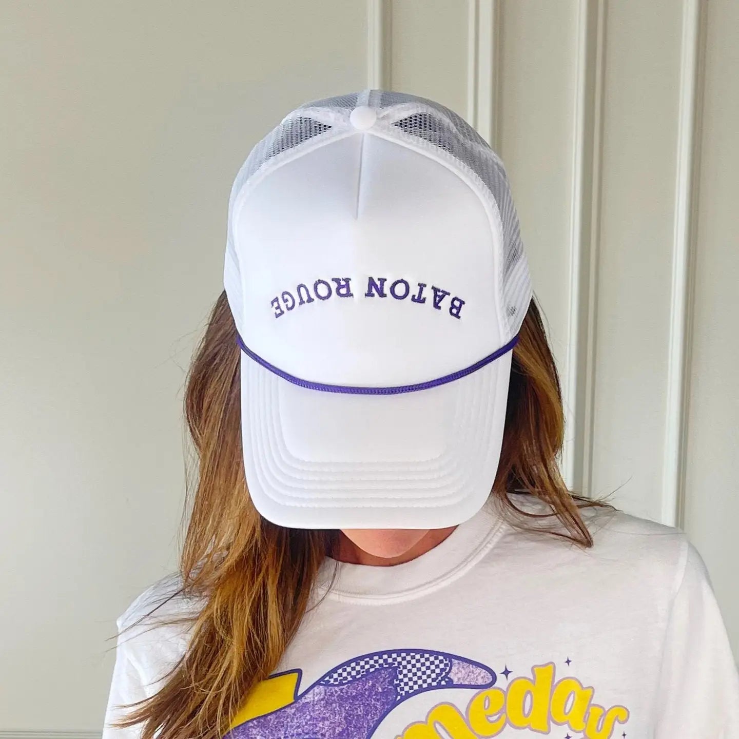 Keep it casual with the CAPITAL CITY TRUCKER. This white and purple mesh-back hat is the definition of cool comfort — perfect for showing off your Baton Rouge pride whether you’re tailgating or on the go.