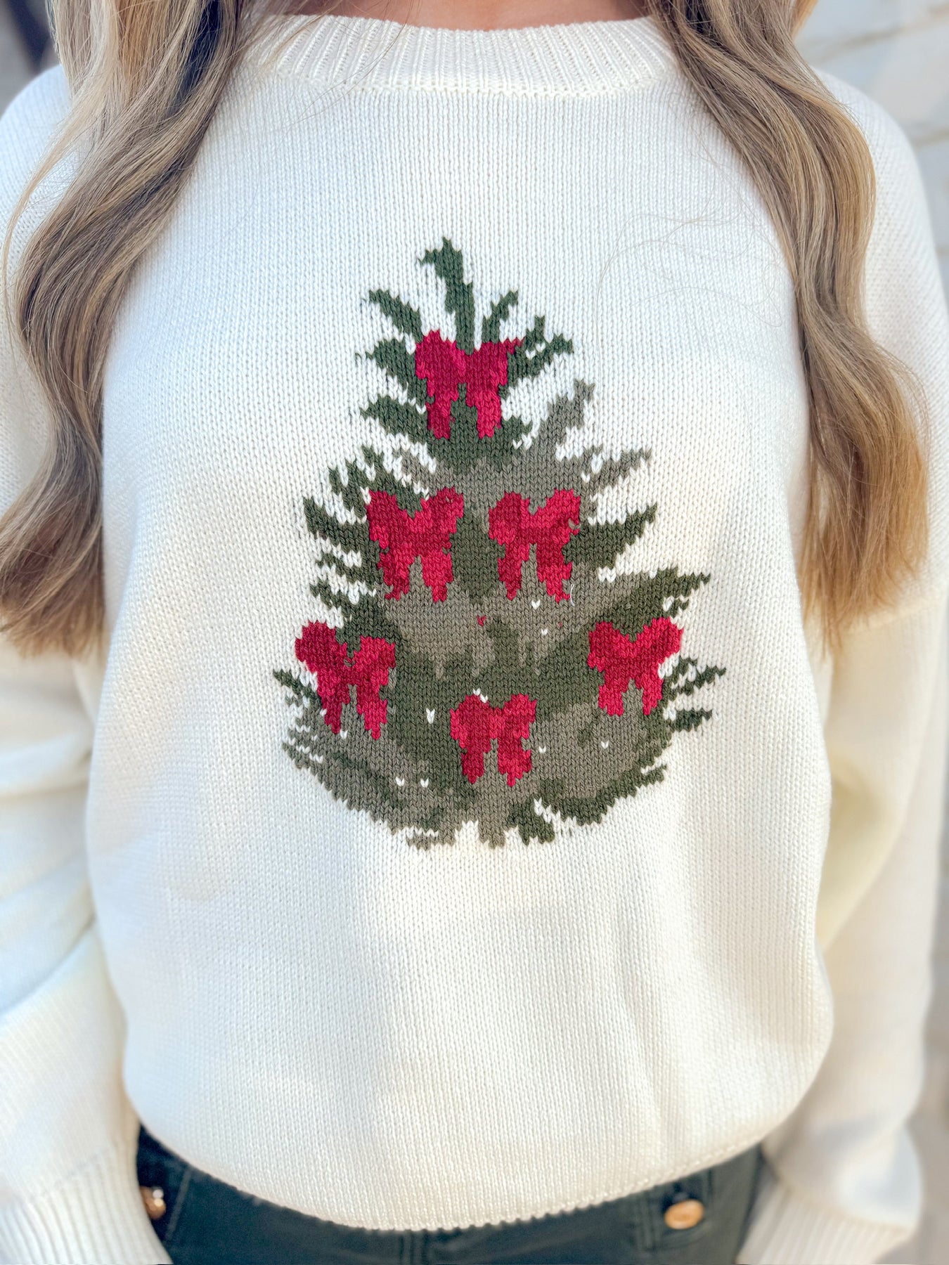 A festive classic you’ll pull out year after year. The MERRY LITTLE TREE Sweater pairs cozy cream tones with an embroidered bow-trimmed tree for the sweetest holiday touch.