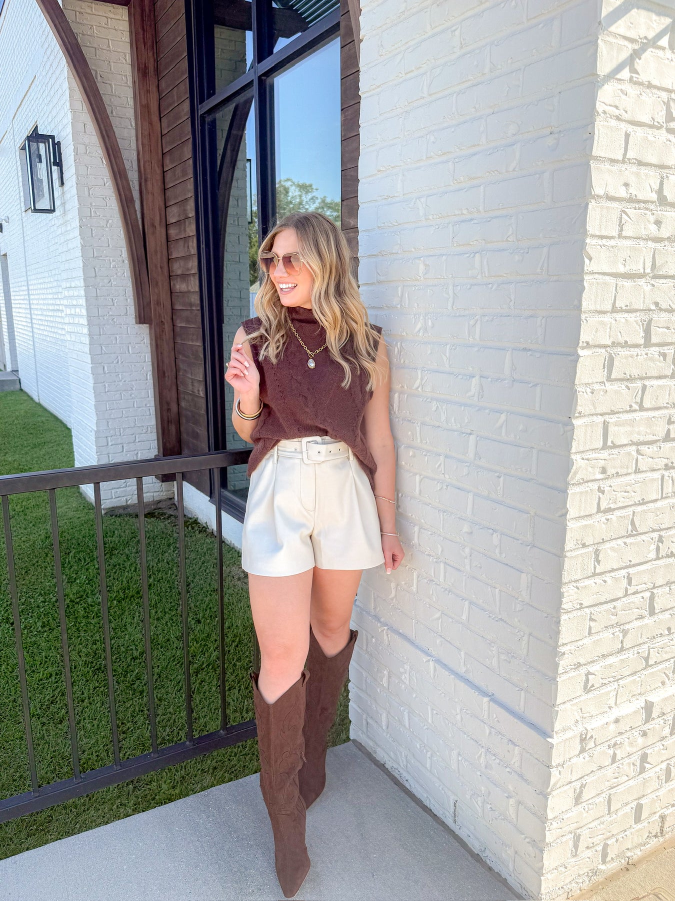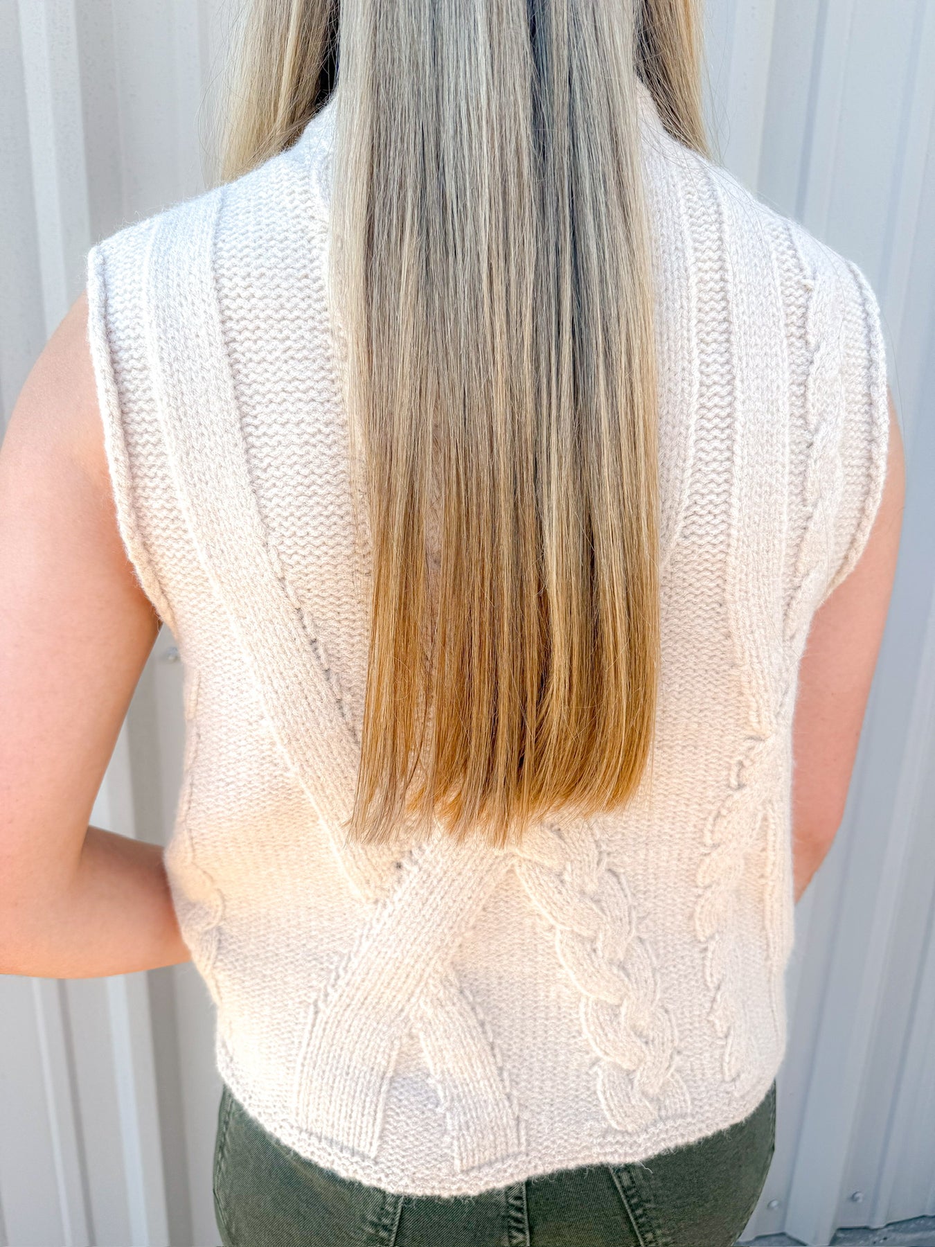 Bring cozy texture to your fall wardrobe with the TEXTURE PLAY VEST. Its soft cable knit, sleeveless design, and modern mock neckline make it a perfect base for layering over tees, blouses, or dresses. Available in oatmeal and brown.