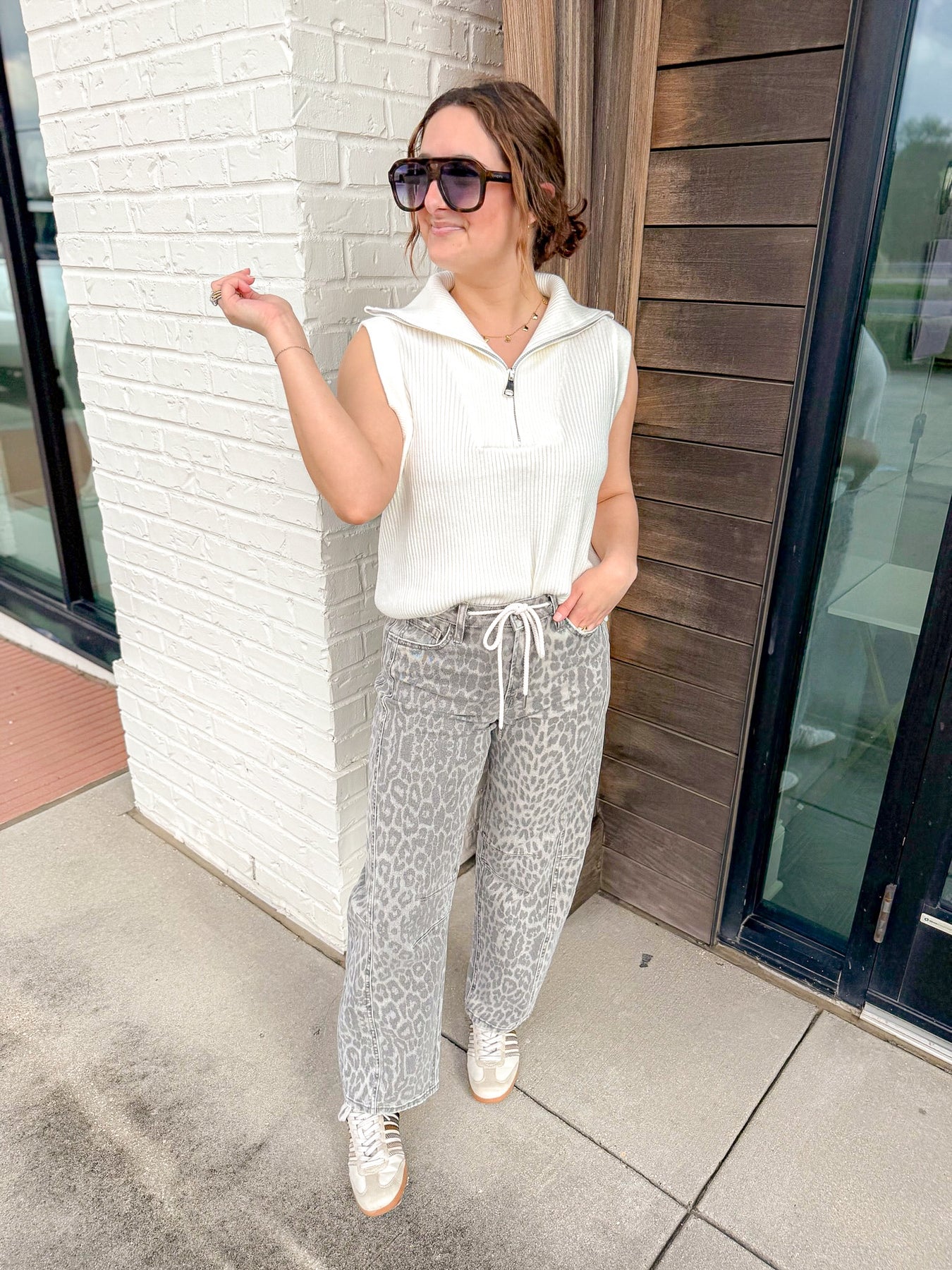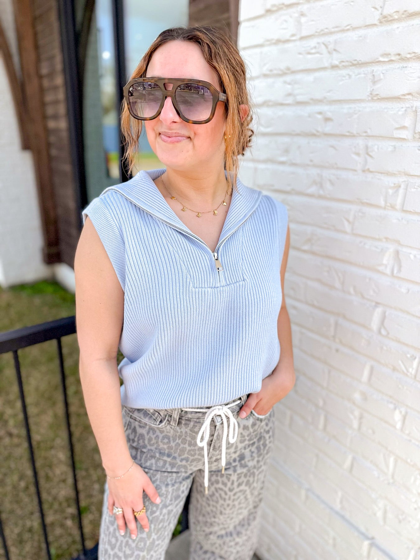 Designed in a soft rib-knit fabrication, this sleeveless sweater features a structured collar with a functional half-zip neckline for that effortless, elevated look. The slightly relaxed fit and wide ribbed hem create a flattering silhouette that pairs perfectly with denim, trousers, or layered under a lightweight jacket.