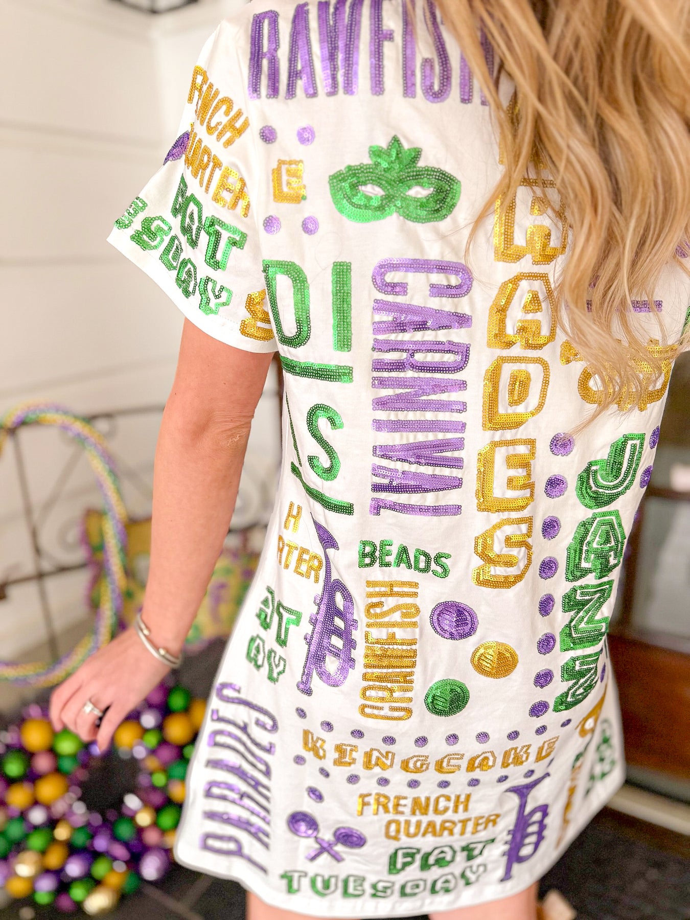 Bring the party wherever you go ! This statement t-shirt dress features allover Mardi Gras inspired sequin graphics in classic purple, green, and gold. From beads and brass to king cake and parades, every inch celebrates carnival season in true Louisiana style. Pair it with denim, sneakers, or boots for parades, parties, and Fat Tuesday fun.