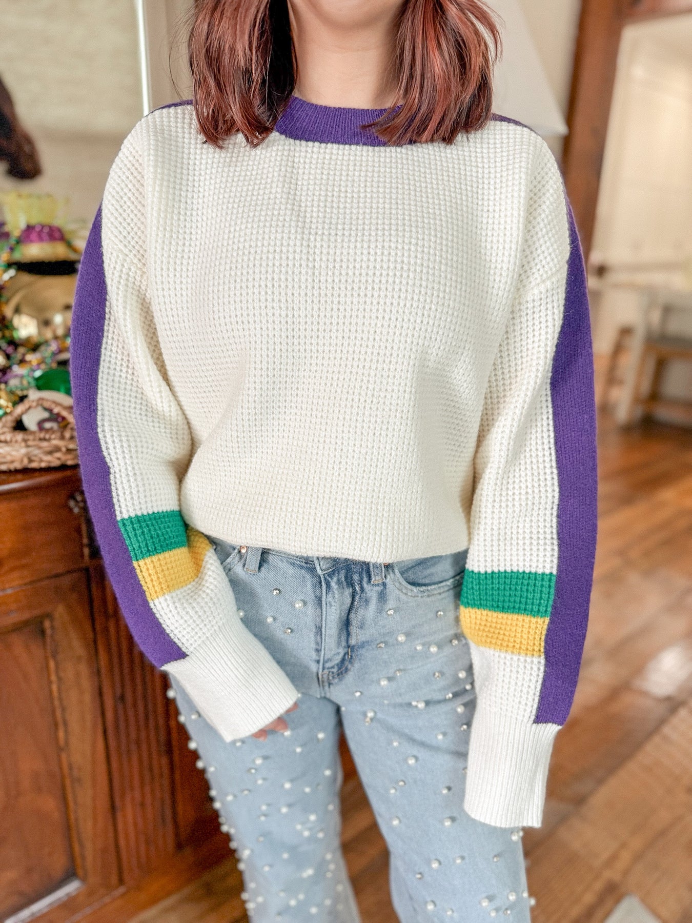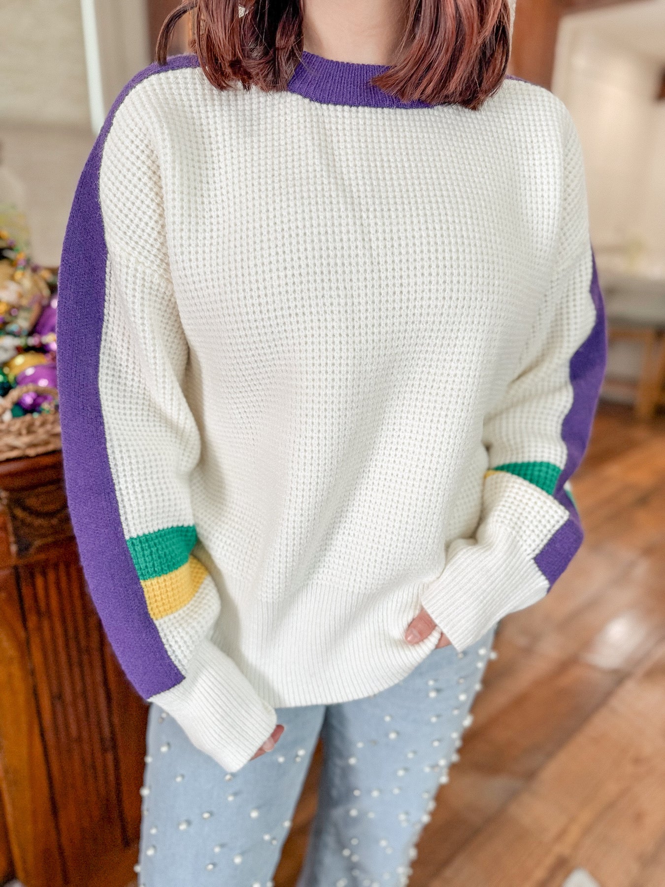 Celebrate Carnival season in style with this Mardi Gras stripe statement sweater. Designed with bold purple, green, and gold accents, this cozy knit delivers the perfect blend of festive and wearable. The relaxed fit makes it easy to style for parades, king cake runs, or casual days leading up to Fat Tuesday. Pair it with denim shorts, jeans, or white denim for an effortless Mardi Gras look.
