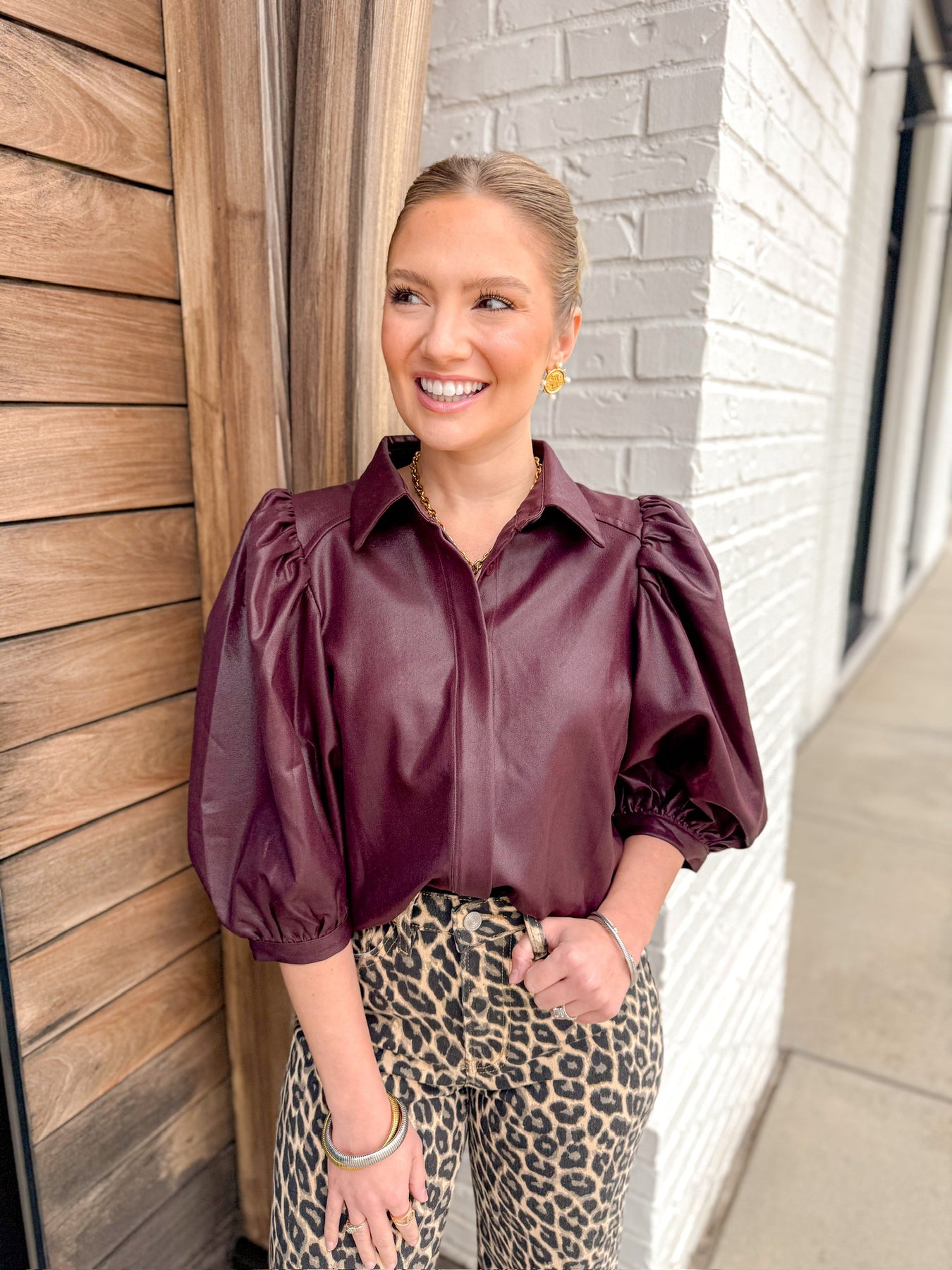 Rich, dimensional, and beautifully structured. This faux-leather blouse brings instant sophistication with its tailored collar and voluminous sleeves.