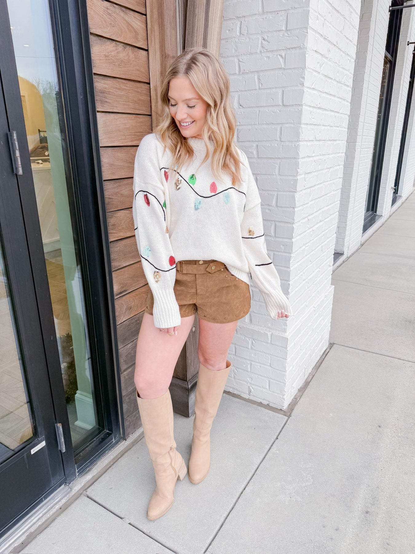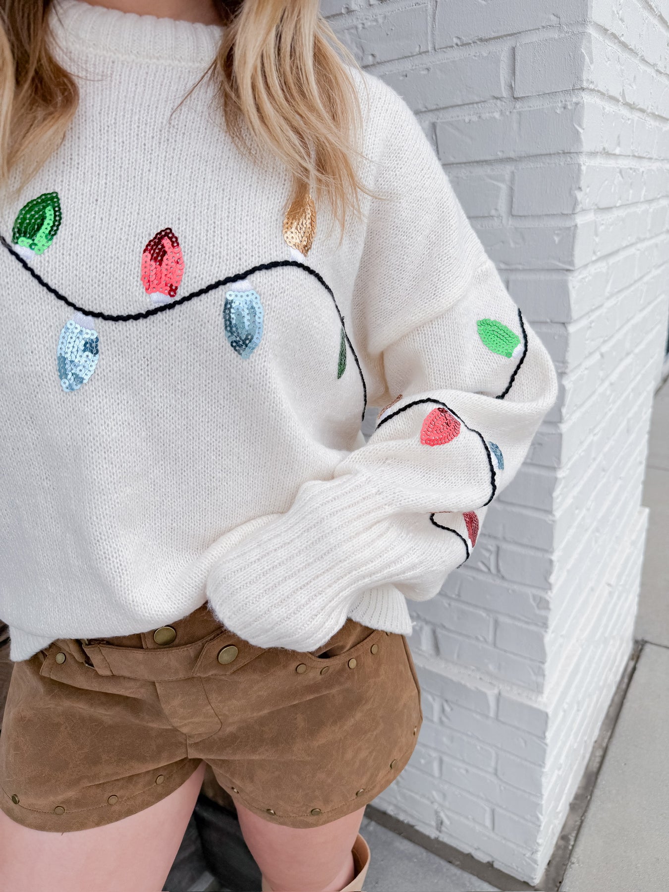 Festive with a polished twist, the CITY OF LIGHTS SWEATER brings cozy charm and subtle sparkle together in one easy-to-wear sweater. Designed in a soft ivory knit, this style features a whimsical string-light design accented with metallic and sequin details for a playful yet elevated holiday feel.