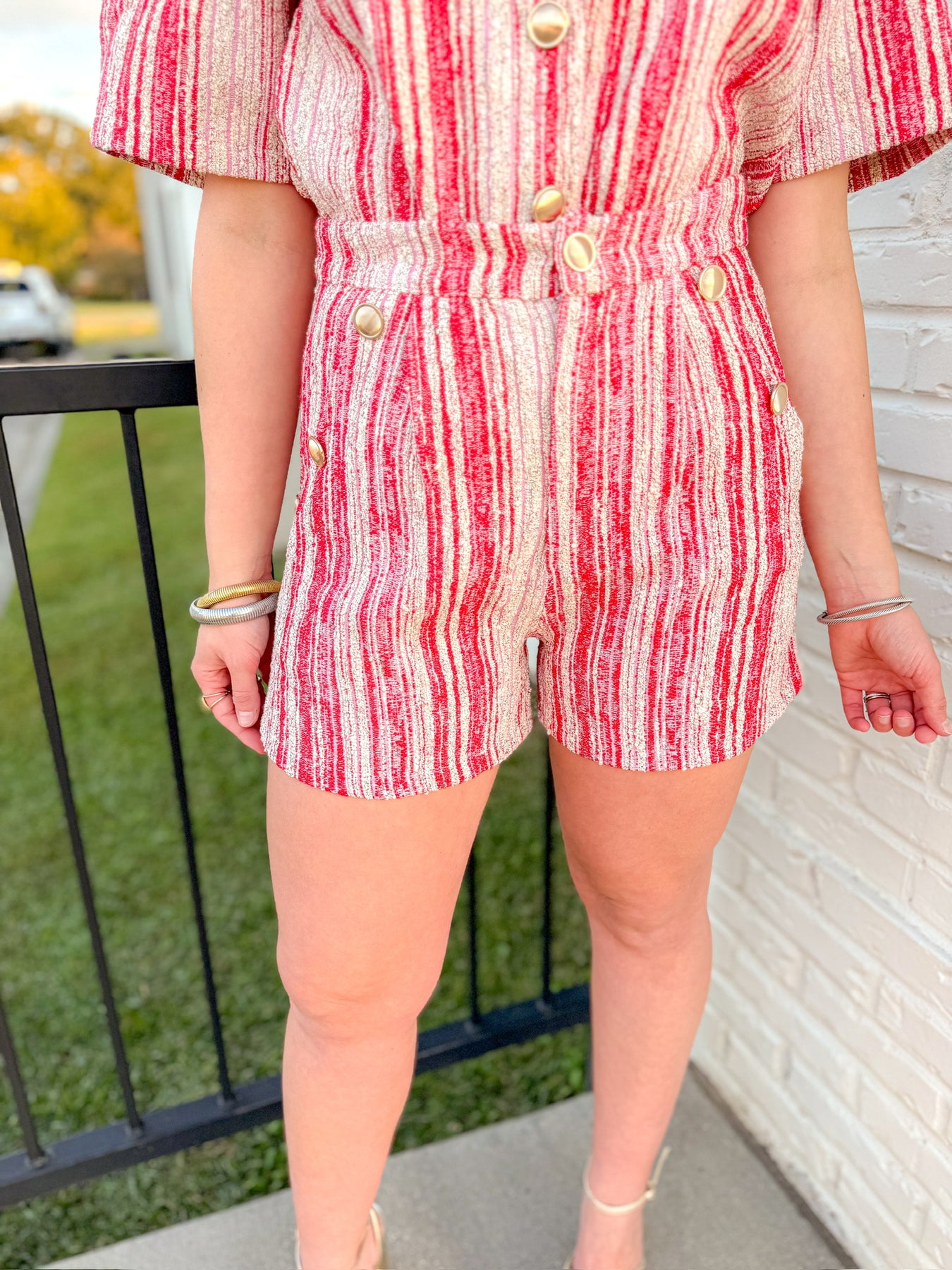 This textured tweed bottom features the same candy-stripe red and white pattern with a subtle shimmer effect. Gold button accents highlight the waistline for a flattering, tailored finish. Comfortable yet elevated, these shorts pair perfectly with the matching top for a standout seasonal set.