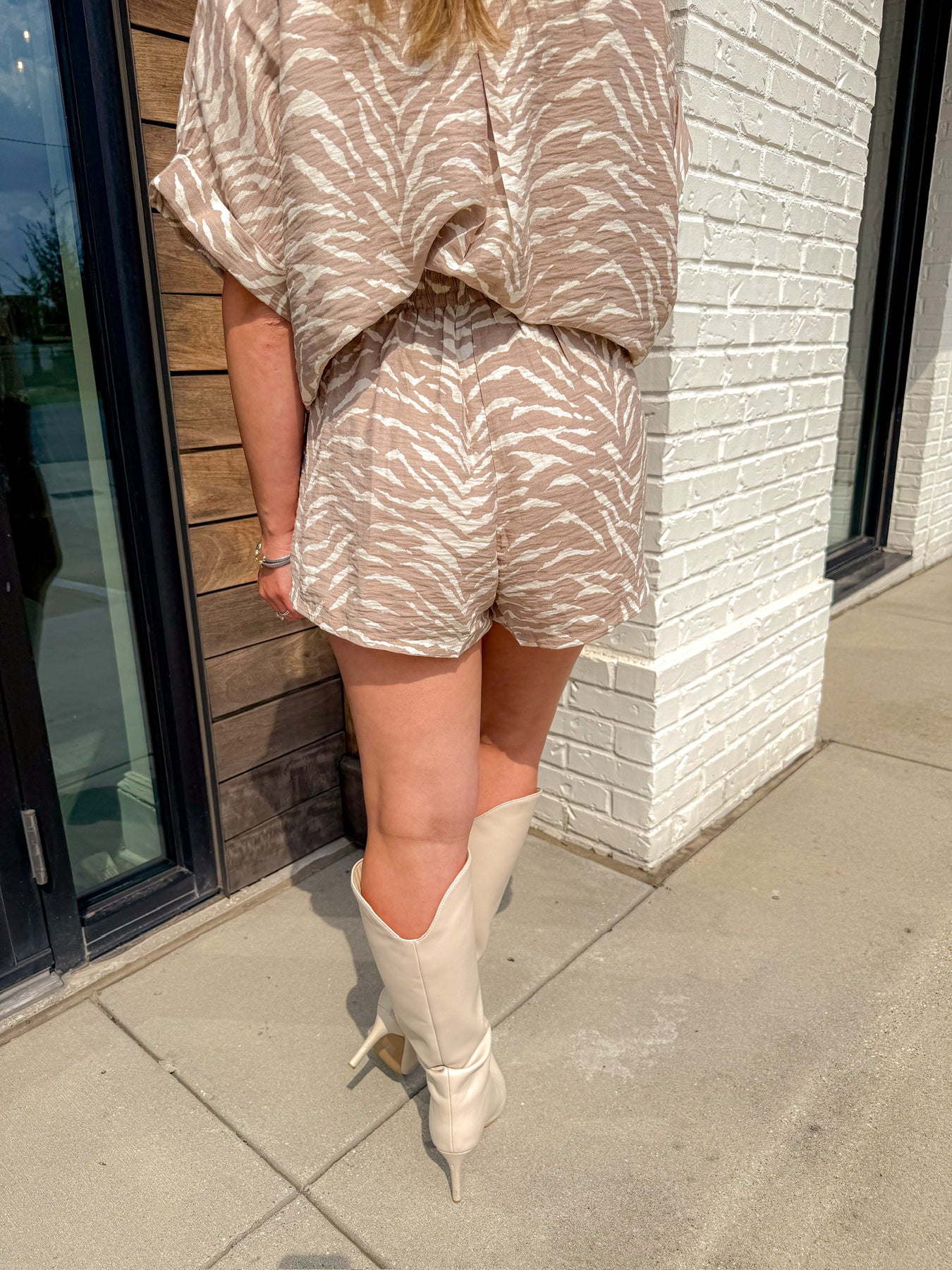 These high-rise shorts feature an allover tiger print in a soft, lightweight textured fabric. An elastic waistband and pockets make them the perfect combo of functional and stylish.
