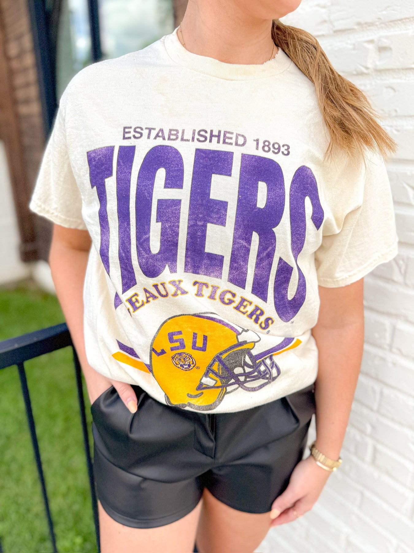 Show your Tiger pride with a throwback twist. The GEAUX RETRO TIGERS TEE features a vintage-inspired LSU football graphic with a relaxed fit and lived-in feel. Pair it with denim or game day skirts for that effortlessly cool look that says Geaux Tigers! in true retro fashion.