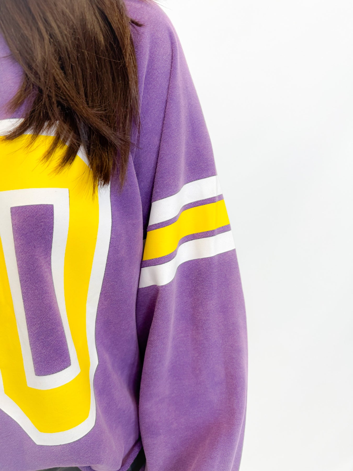 This purple long sleeve top is made with a soft, vintage-wash feel and features bold yellow varsity stripes and oversized “00” graphic on the front. With its relaxed fit and sporty vibe, it’s the ultimate throw-on-and-go piece for tailgates, stadium seats, or just repping your team spirit all season long.