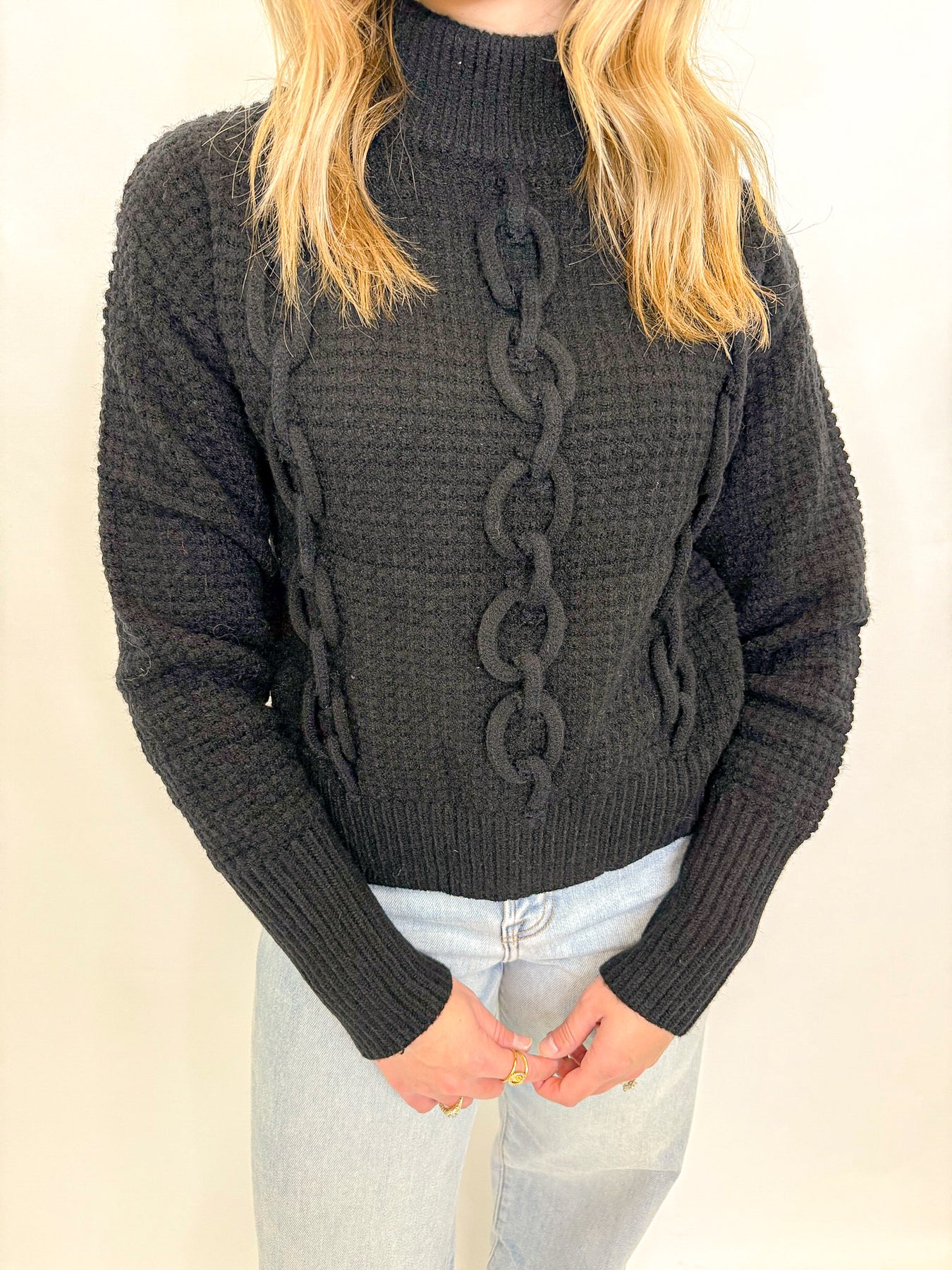 The LINK UP SWEATER adds a bold twist to a classic knit. Featuring raised chain-link detailing down the front and a cozy mock neck, this sweater brings texture and edge to your winter lineup.