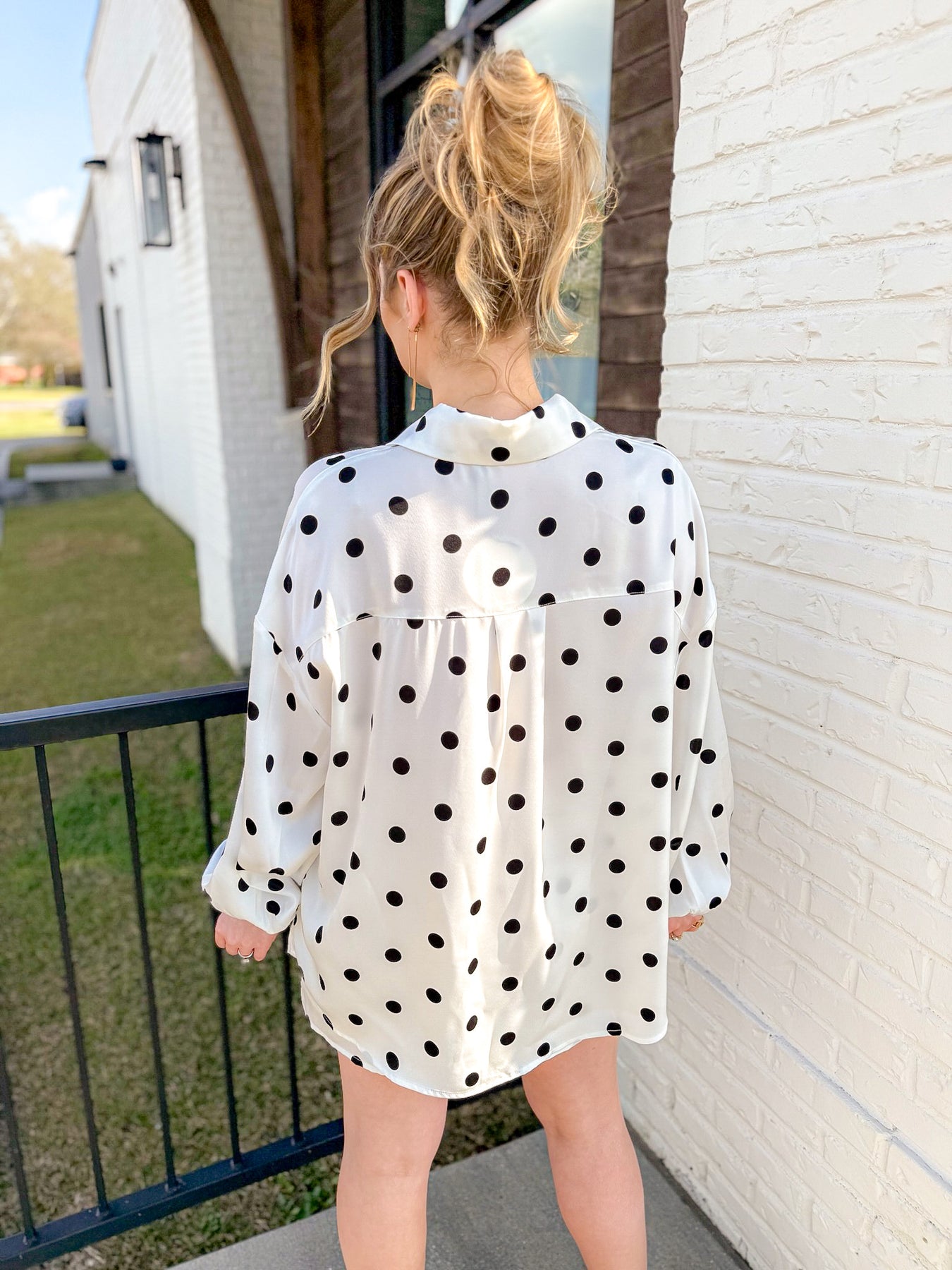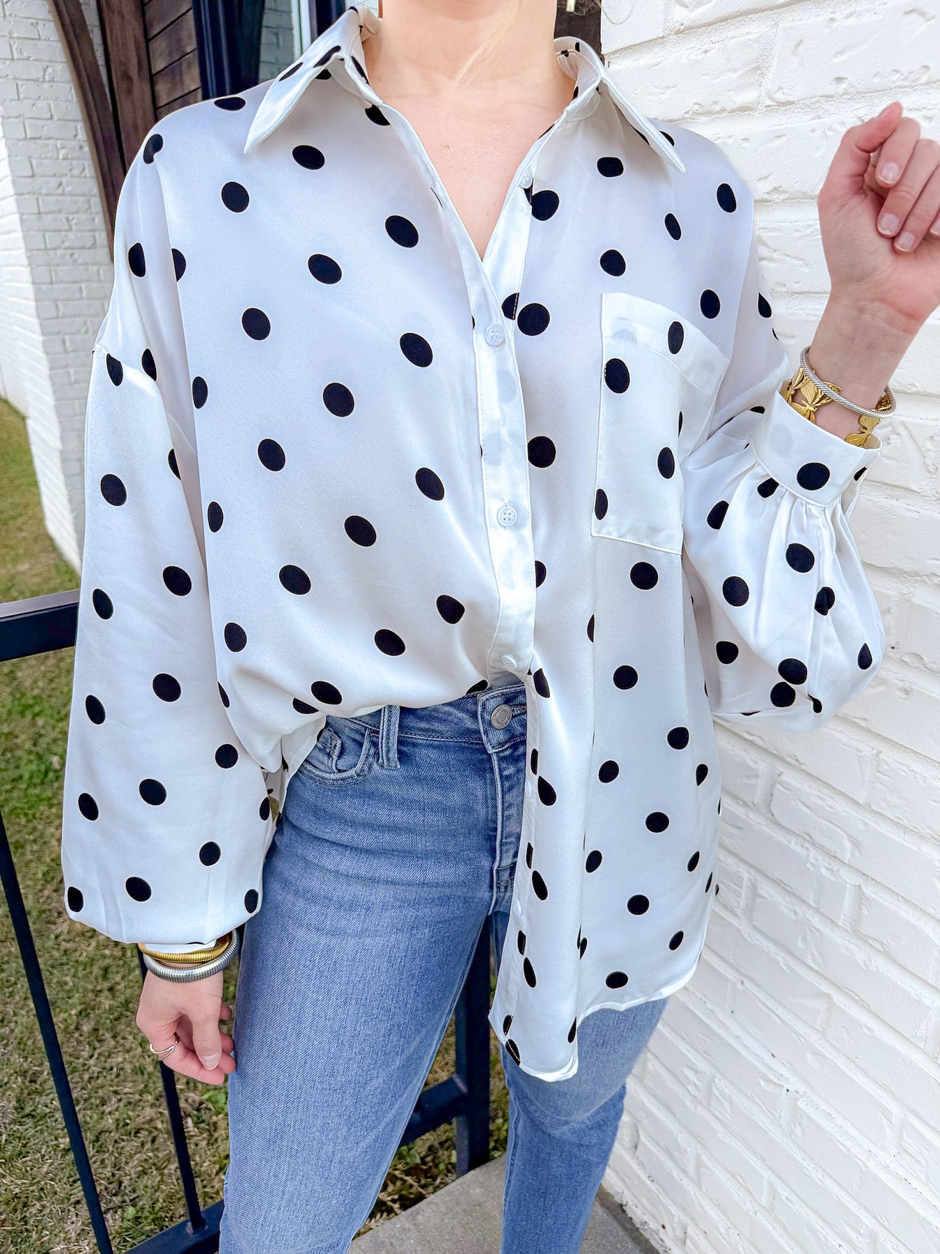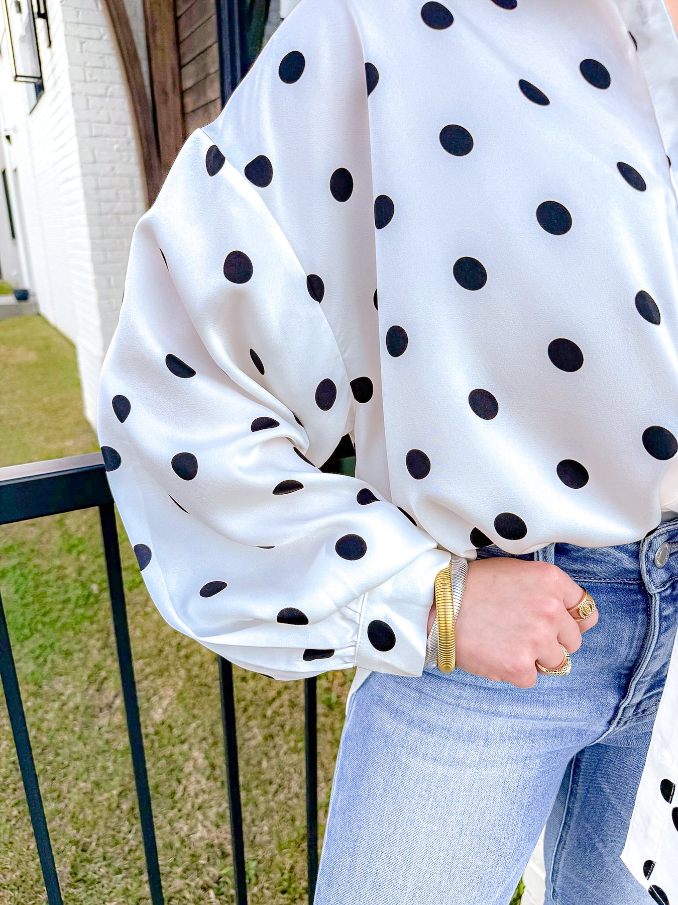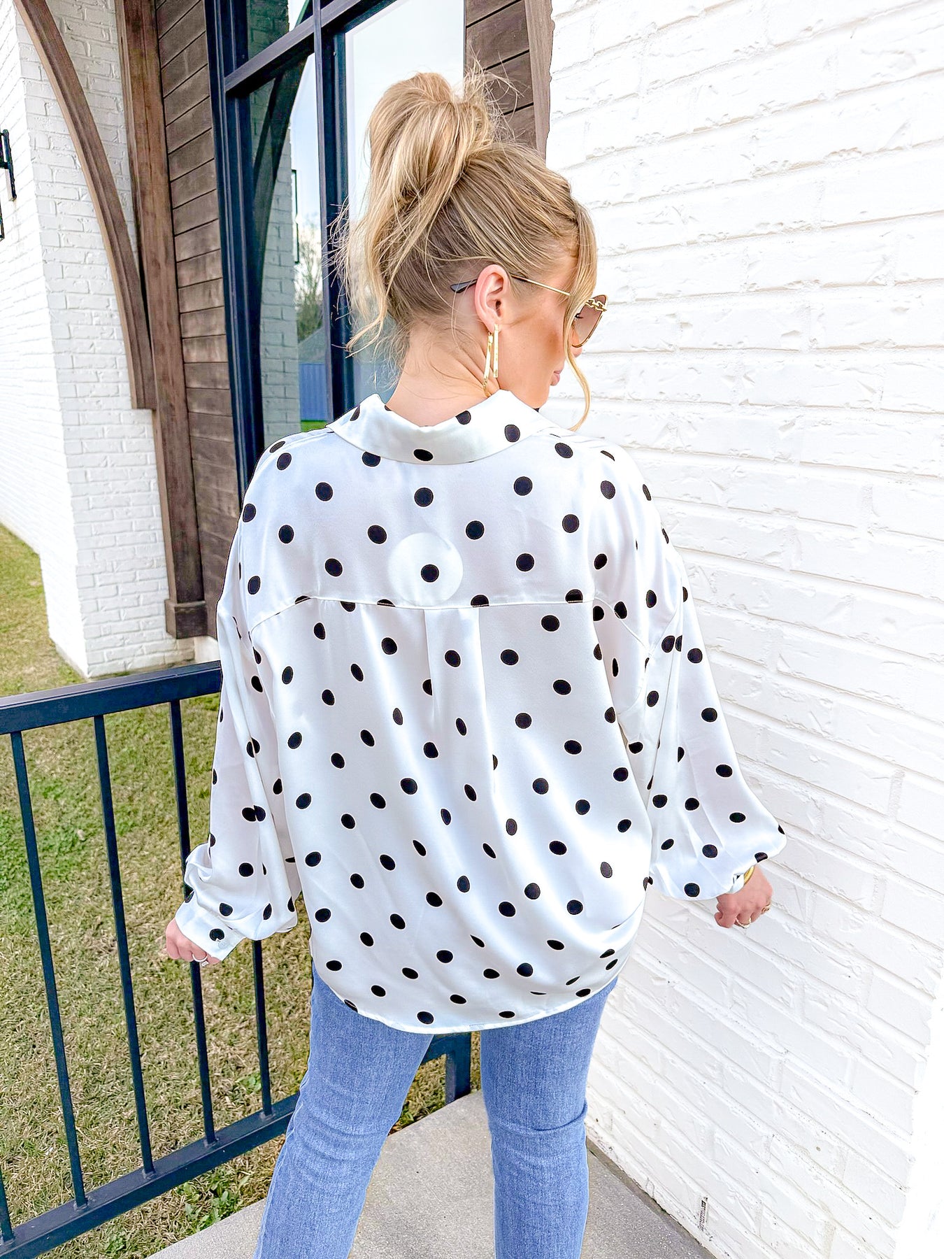 The CONFIDENTLY CLASSIC SET TOP is your statement classic. Designed in an ivory base with bold black polka dots, this silky button-front blouse delivers effortless sophistication with a modern edge.