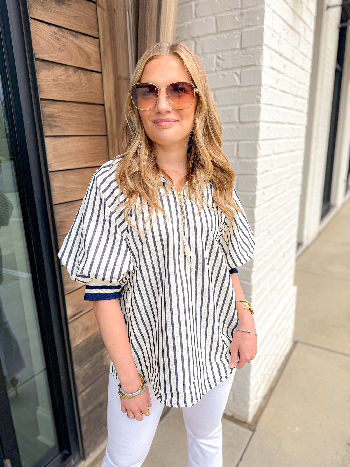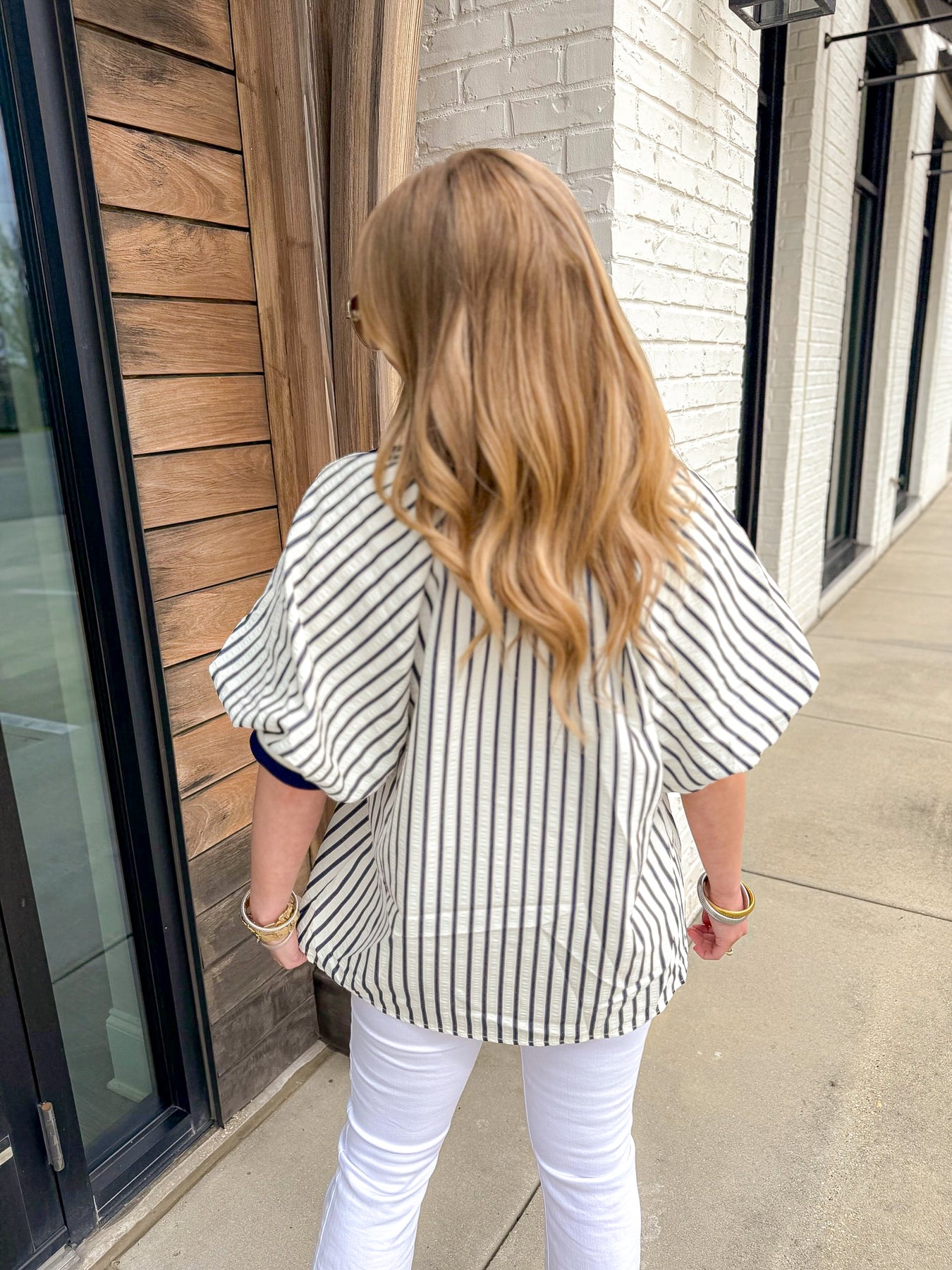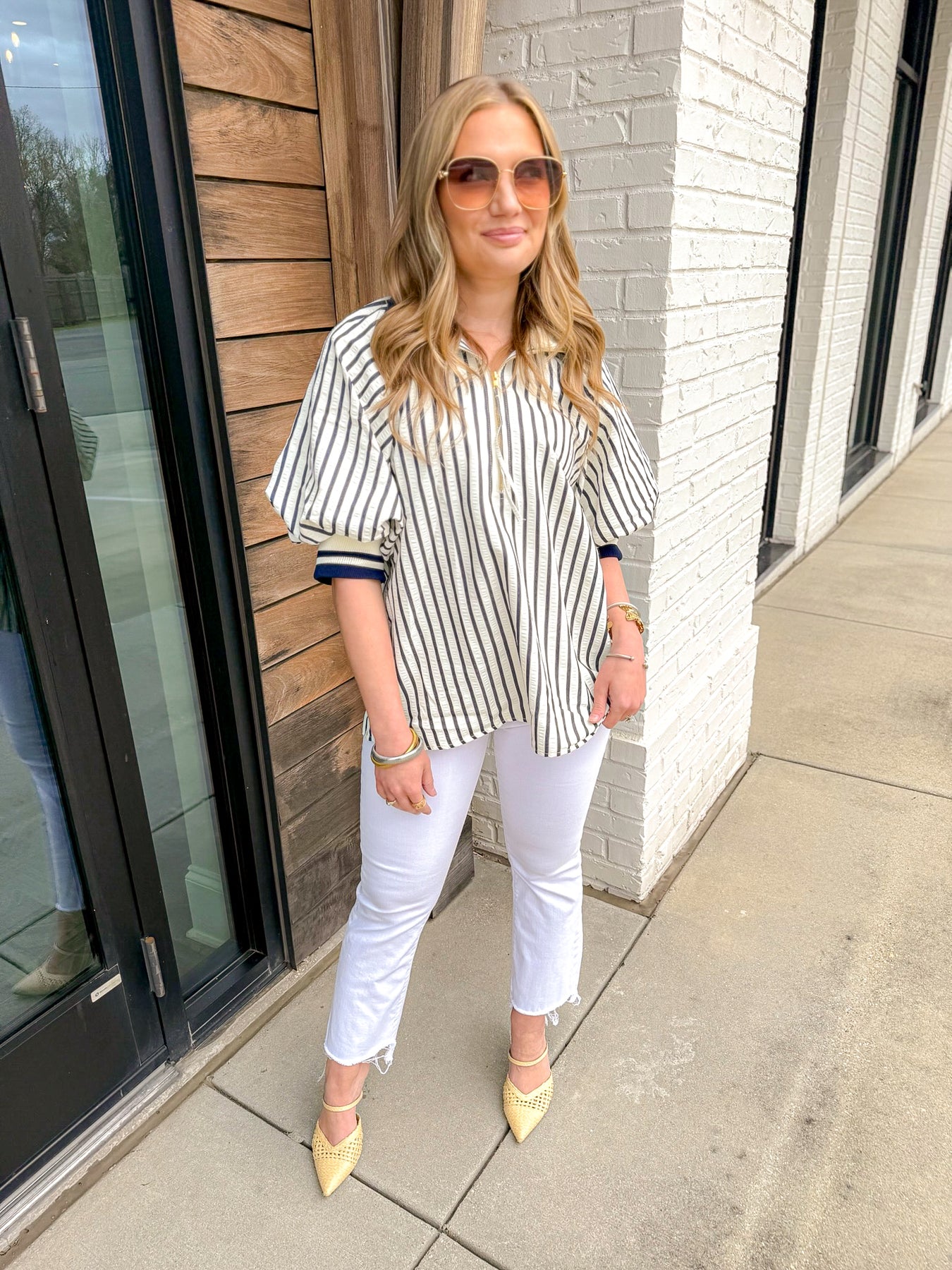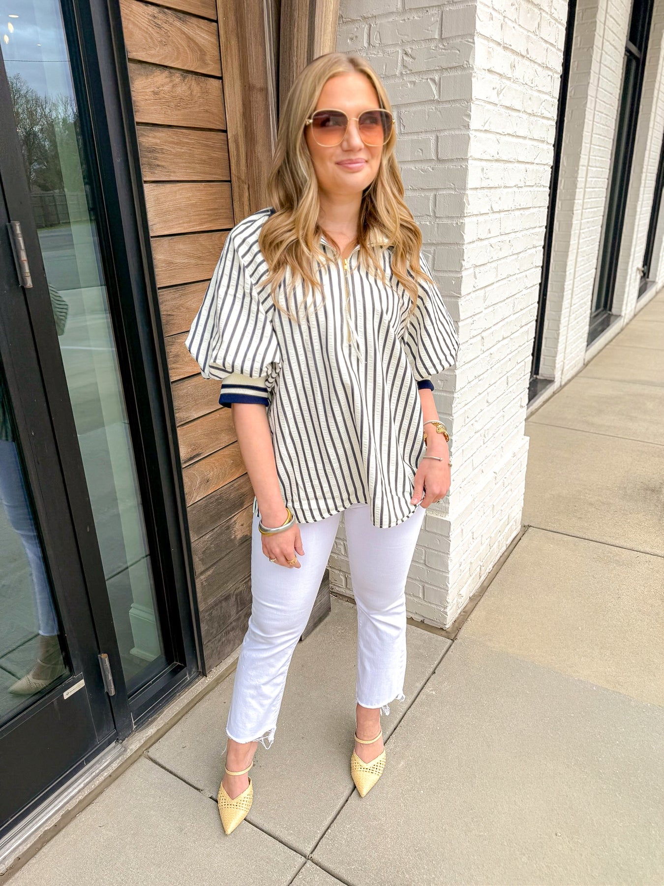 Light, airy, and made to move with you — this flowy striped top is effortless in the best way. The relaxed silhouette gives you that easy drape without feeling oversized, while the breathable fabric keeps it comfortable all day long. It’s polished enough for errands or lunch plans, but relaxed enough to feel like an everyday favorite.