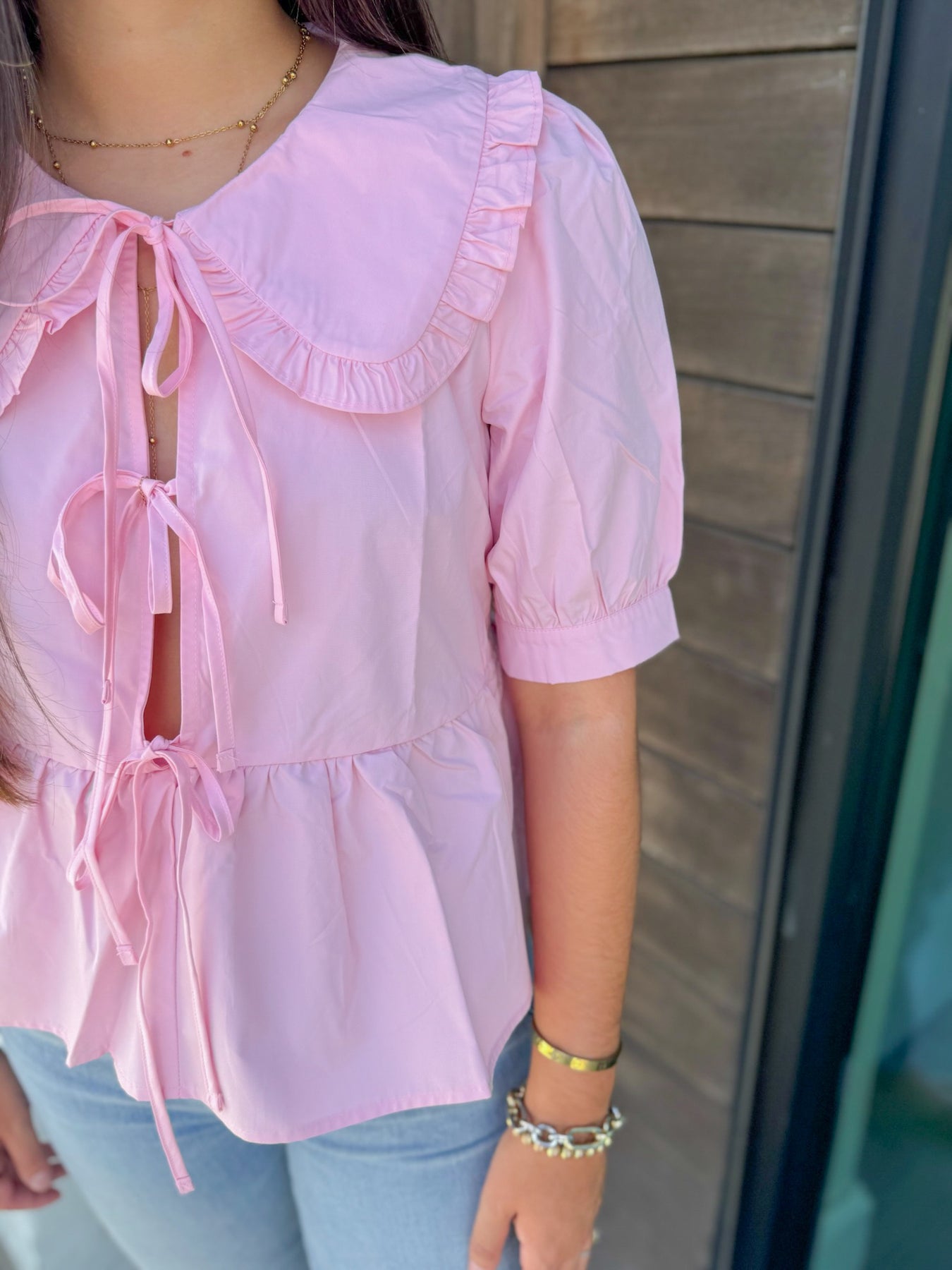 Designed with a Peter Pan-style ruffle collar, three front tie details, gathered waist seam, and puff sleeves, it’s equal parts polished and playful. Lightweight and eye-catching in the perfect shade of pink.