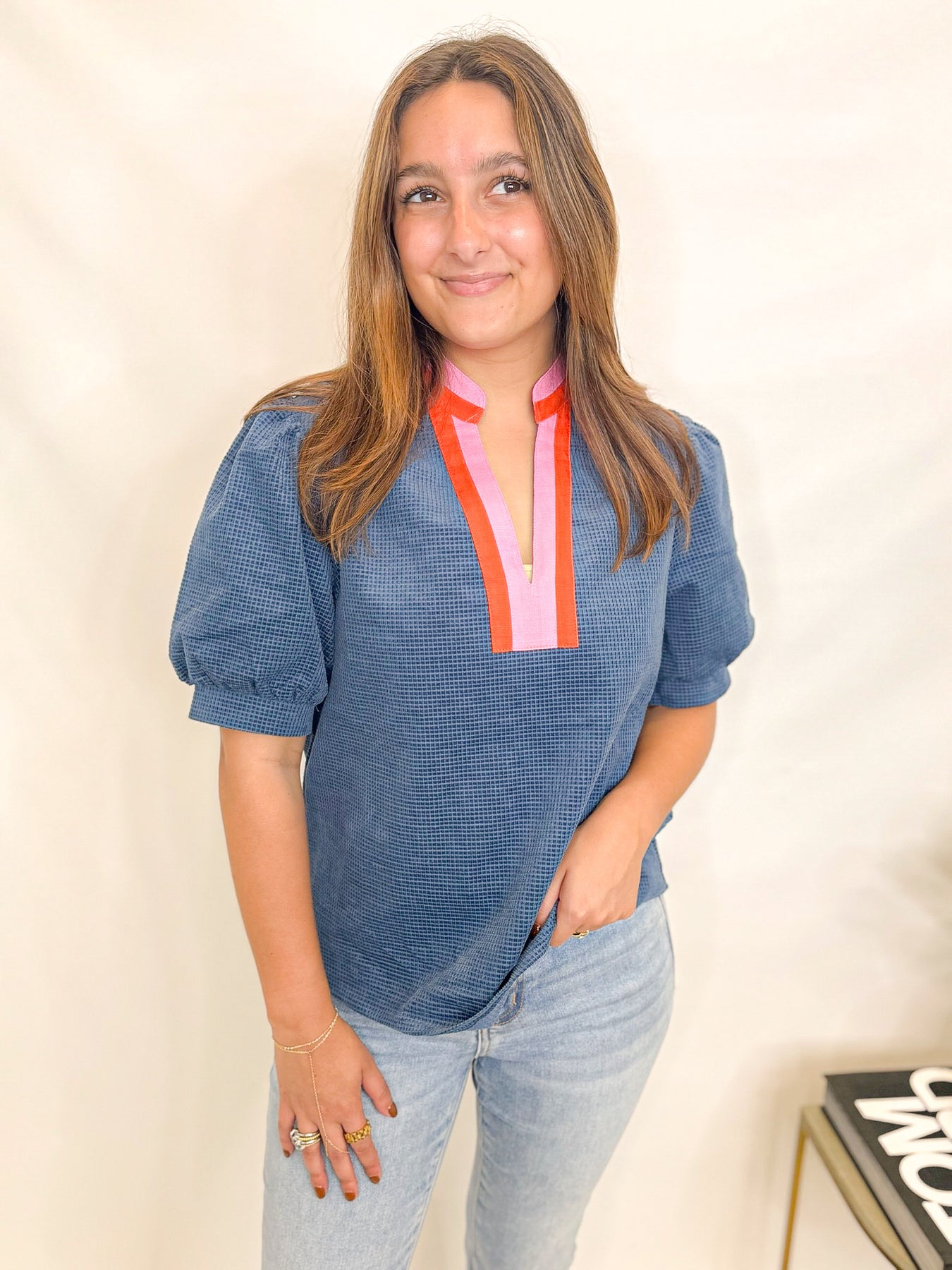 Add a pop of personality to your wardrobe with the COLORBLOCK CHIC BLOUSE. Designed with a textured blue base, this blouse stands out with its bold colorblock neckline in vibrant red and pink. The puff sleeves add just the right touch of volume, while the relaxed fit makes it easy to style with denim, trousers, or tucked into skirts. Whether you’re heading to brunch or dressing up for the office, this versatile blouse is a statement-maker.