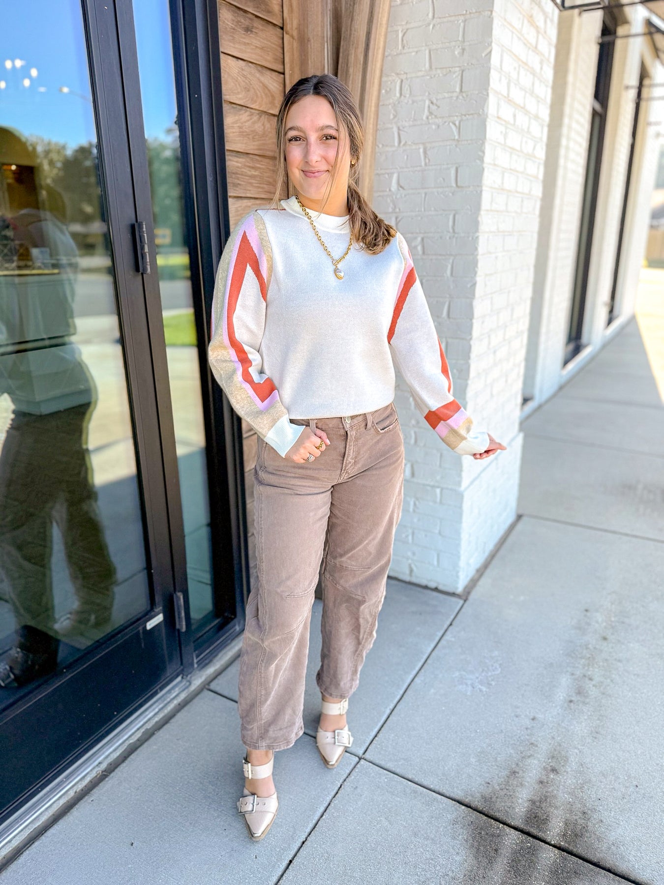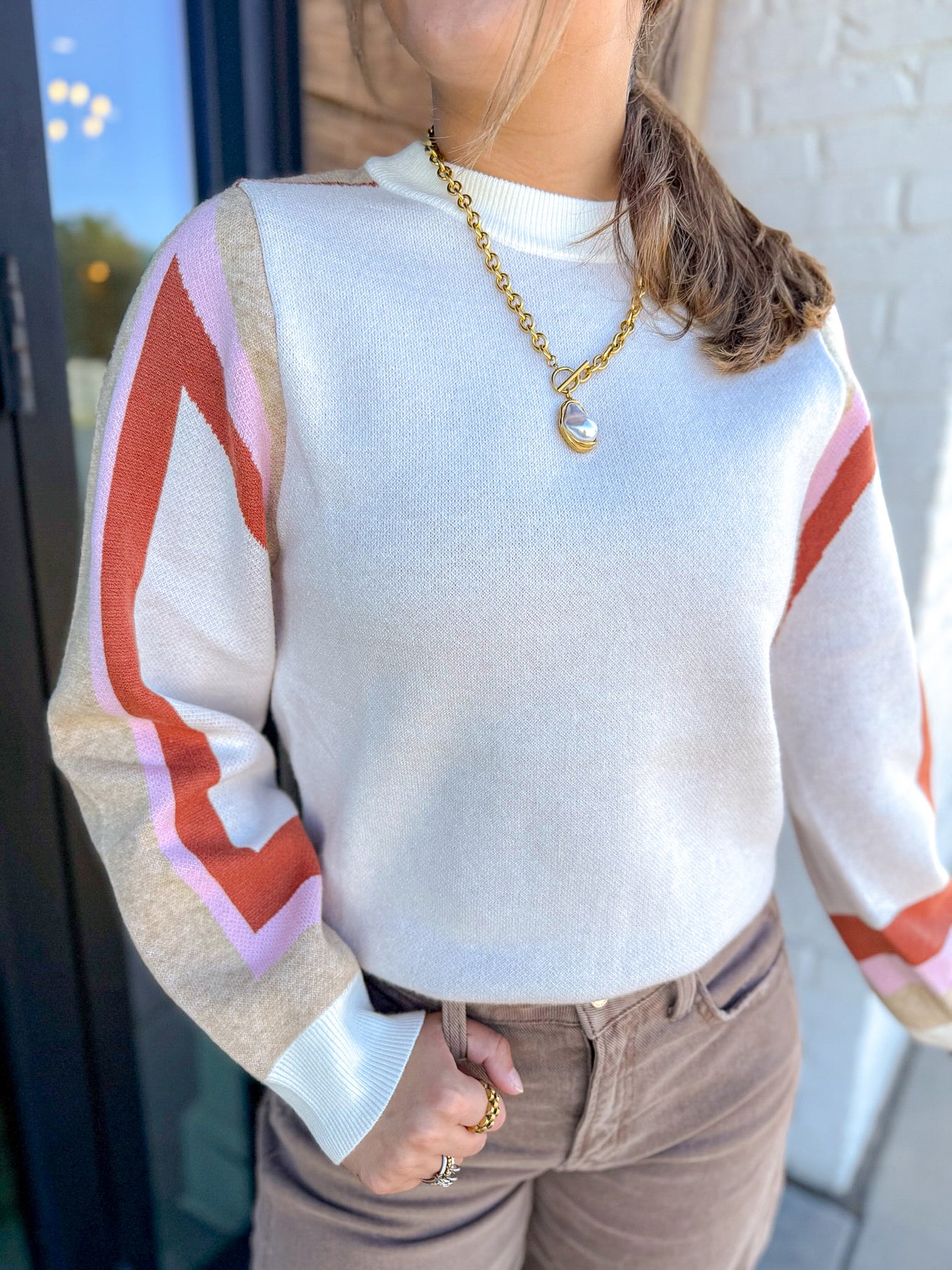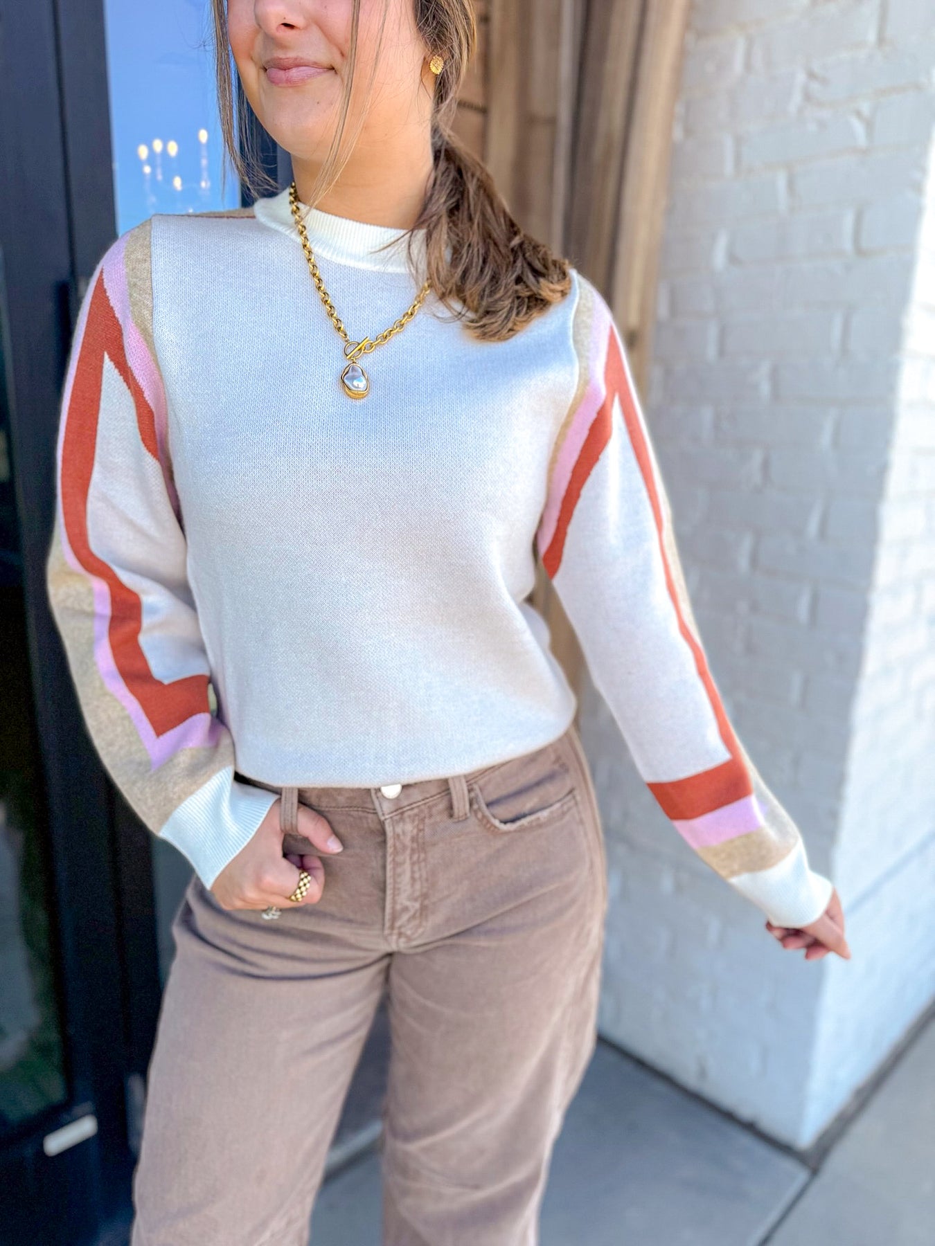 The LINE UP SWEATER brings effortless style with its modern stripe detailing and soft neutral base. Featuring pops of blush, camel, and rust along the sleeves, this cozy knit blends retro charm with everyday wearability.