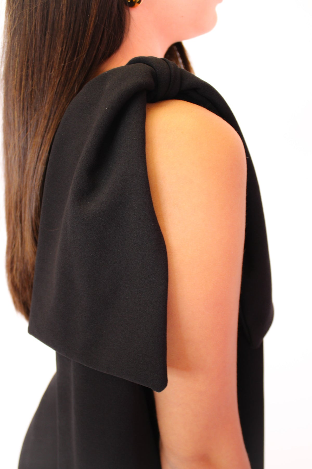 This sleek black floor-length gown features a bold one-shoulder design adorned with a statement bow, adding a touch of drama and sophistication. Its figure-flattering silhouette flows effortlessly, making it perfect for a black-tie event or a glamorous evening out.