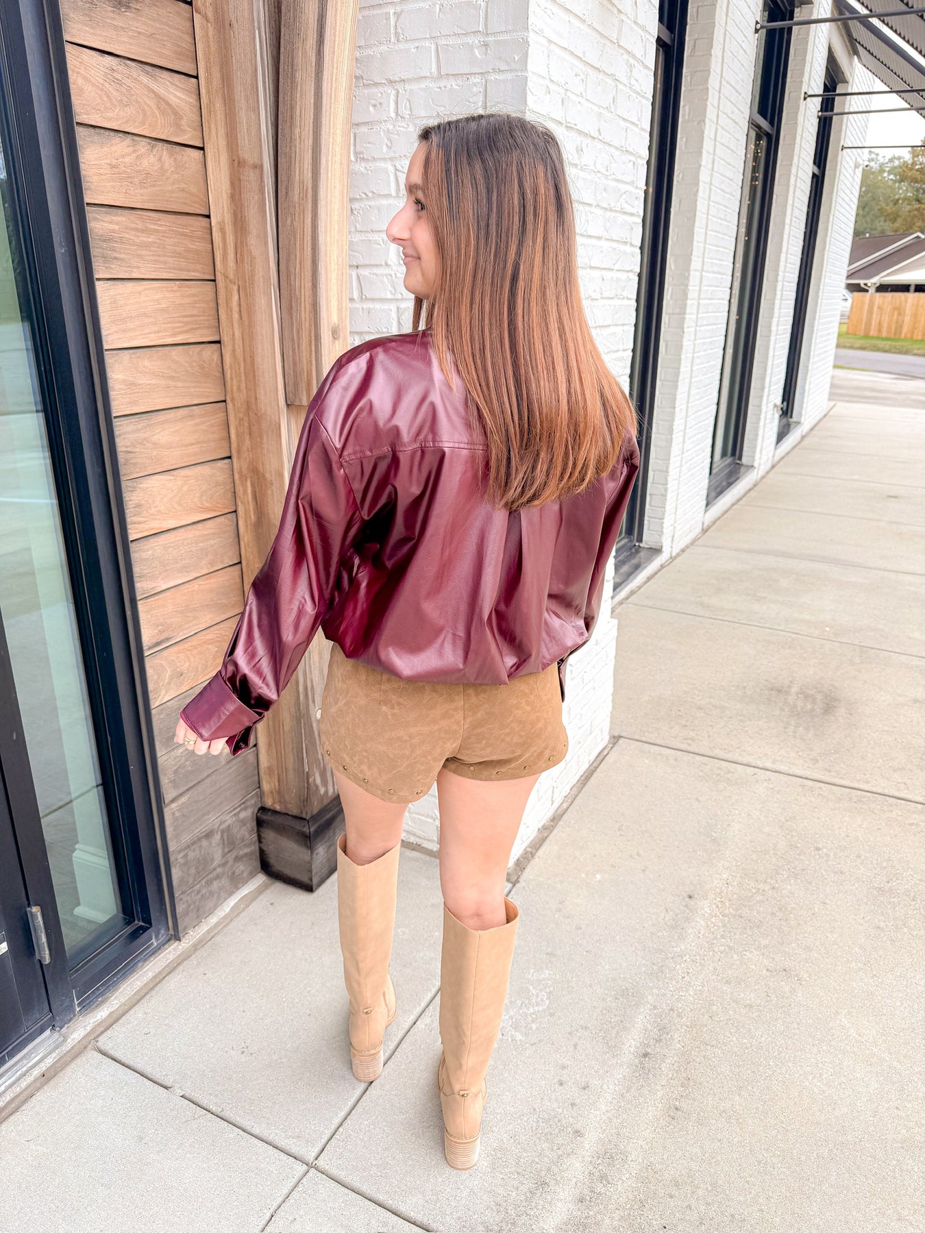 A bold take on a classic buttondown. This wine faux-leather top features a structured collar, chest pocket, and a lightly cropped silhouette for the perfect mix of polished and playful. Style for holiday dinners, concerts, or any night you want to feel a little extra.