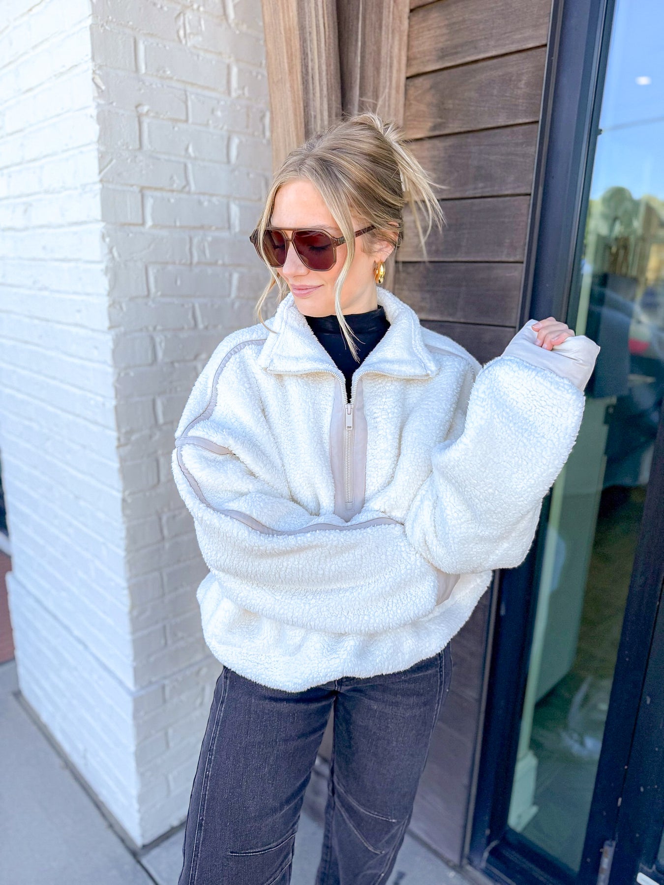 The COZY PATH PULLOVER brings effortless comfort in a plush sherpa knit with a half-zip neckline and subtle contrast trim. Perfect for coffee runs, casual layering, or weekend lounging.