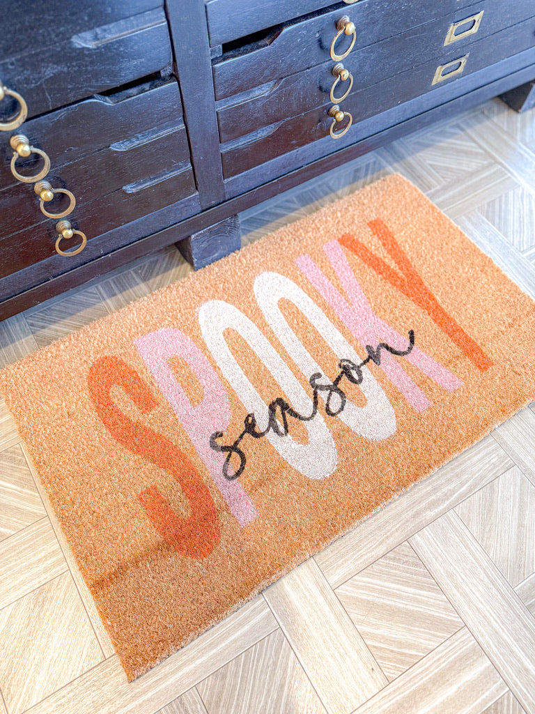 Welcome guests in festive style with the Spooky Season Doormat. Featuring bold seasonal lettering in orange, white, and pink, this durable coir mat brings a playful pop of Halloween spirit to your entryway. Perfect for layering with other rugs or letting it stand alone, it’s the ultimate fall décor essential.