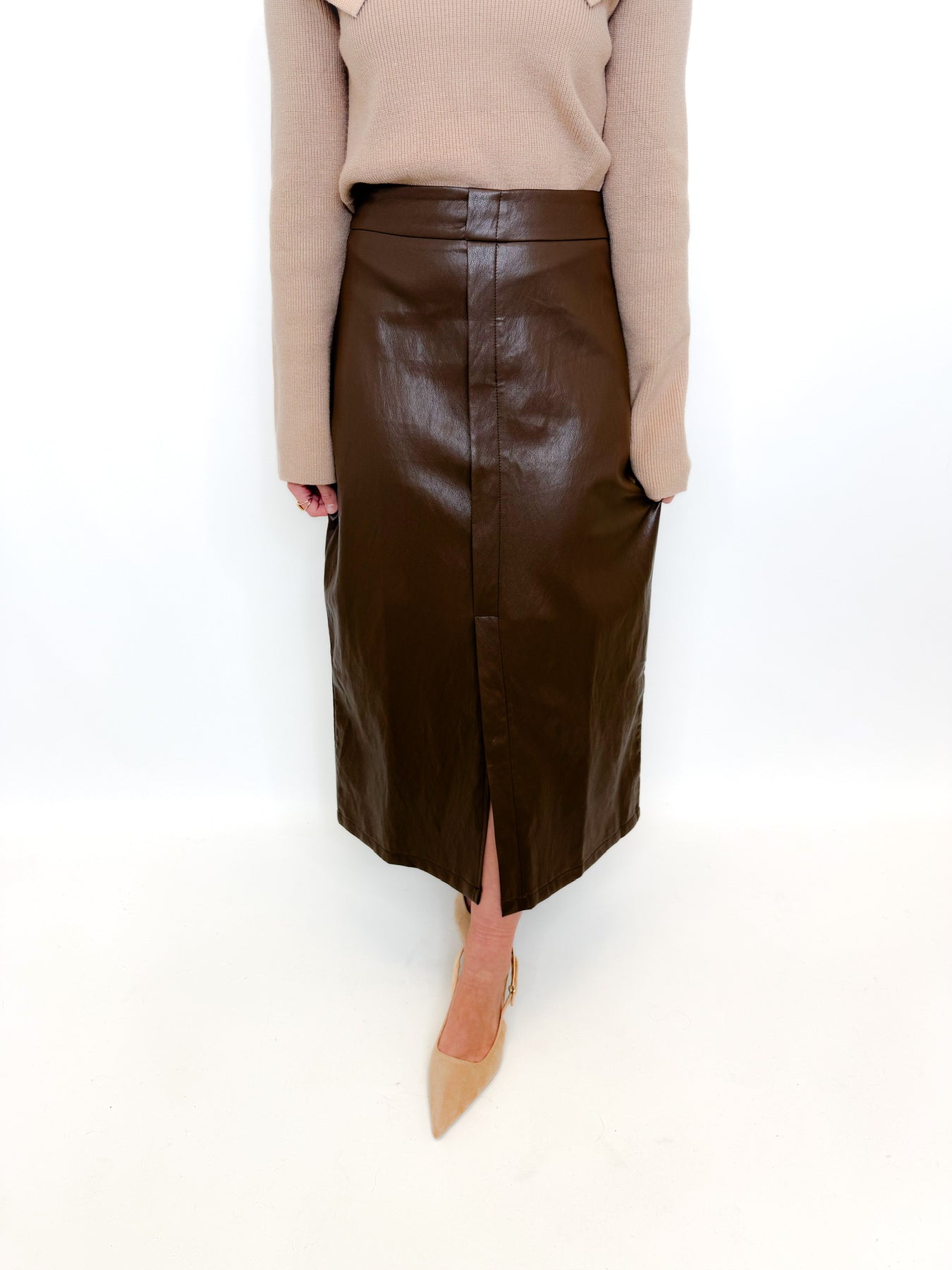 The CITY EDGE MIDI SKIRT delivers sleek sophistication in luxe faux leather. Featuring a front slit and streamlined silhouette, it’s the perfect mix of bold and polished — made to elevate your everyday rotation.